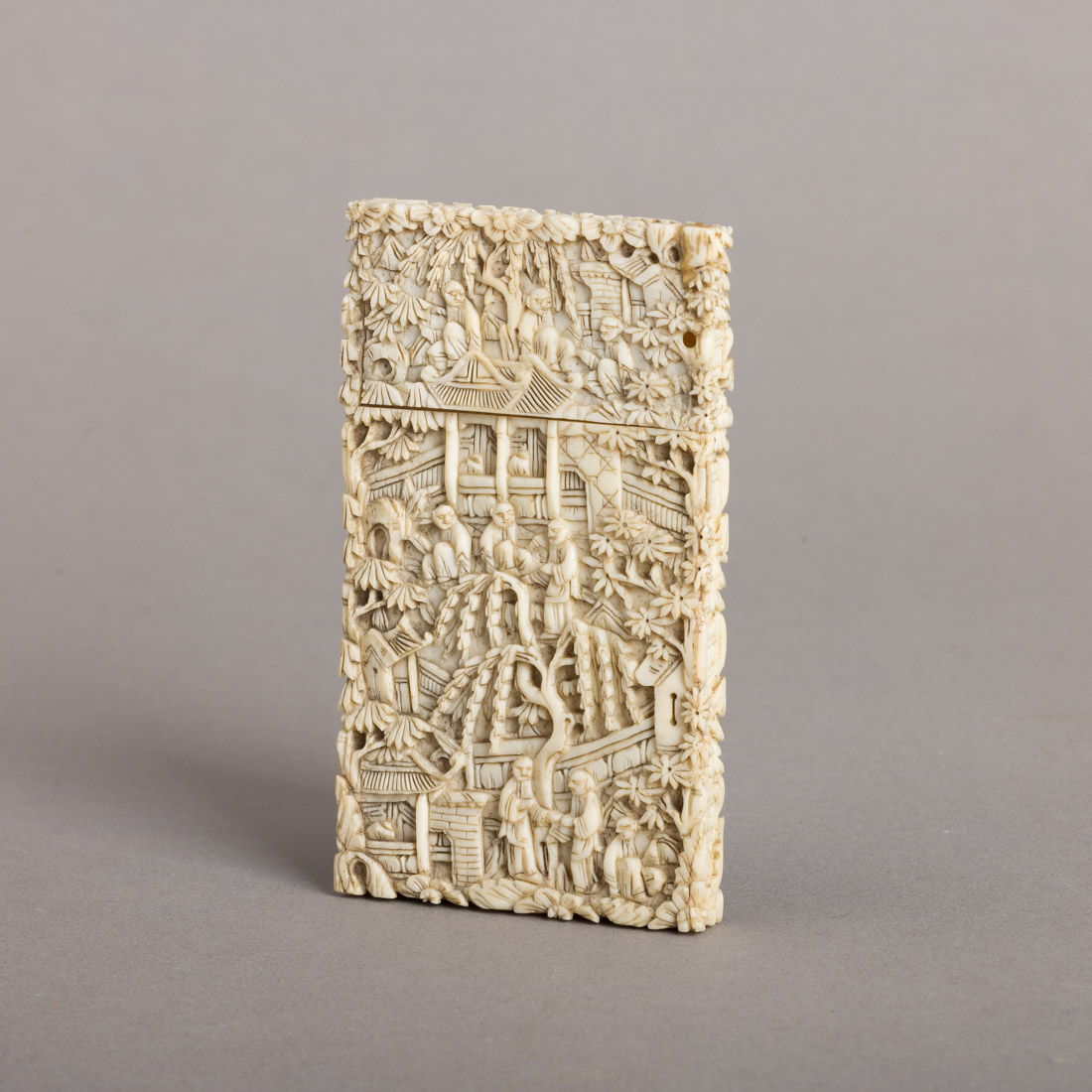 Em marfim minuciosamente esculpido, decoração relevada "paisagem com pagodes". China, Séc. XIX/XX. Sinais de uso, tampa com pequenos defeitos.