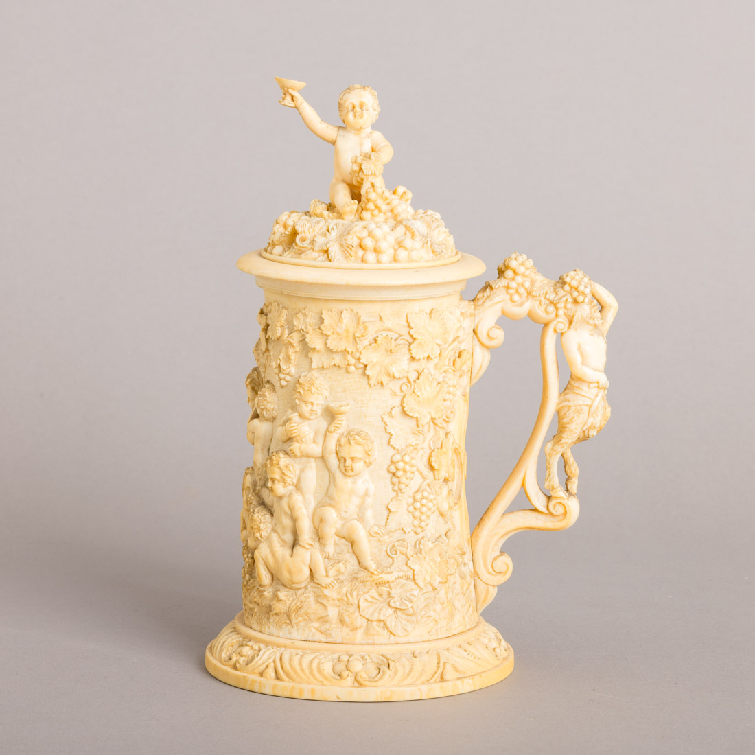 Em marfim esculpido, decoração relevada "Putti, parras e uvas", cartela com monograma e fauno na pega. Interior em prata dourada. Europa, Séc. XIX. Sinais de uso, pega com ligeiras fissuras, tampa com fissura no aro. Peso total aprox.: 750 g. Dim.: 22,5cm.