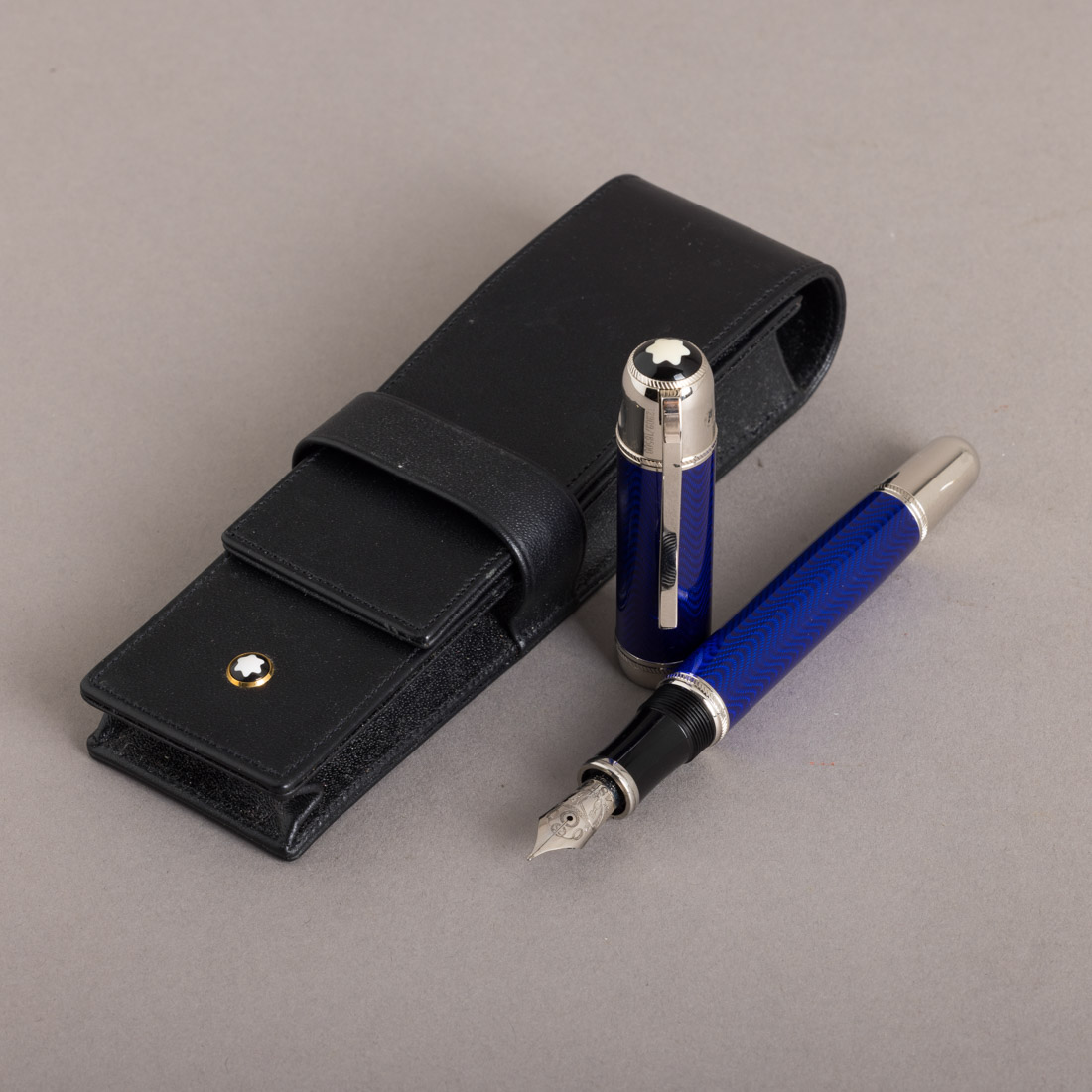 Em metal prateado e resina esmaltada azul, aparo em ouro 18kt. Edição limitada nº 12909/18500. Com estojo. Sinais de uso e pequeno defeito na tampa.