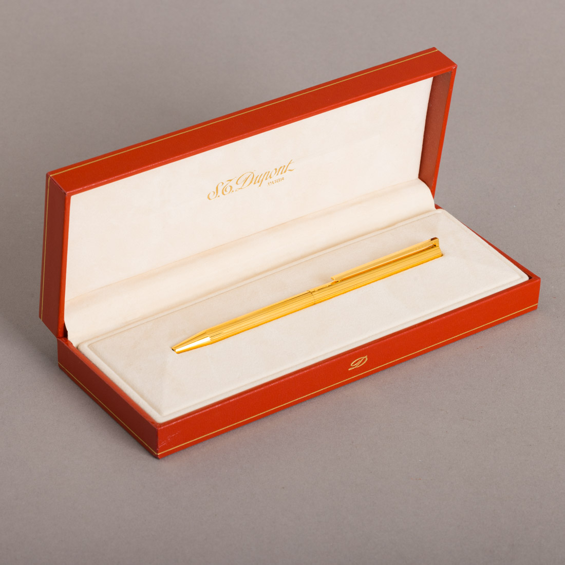 Em plaqué de ouro. Marcado S.T.Dupont. França. Com caixa e documentos originais. Sinais de uso.
