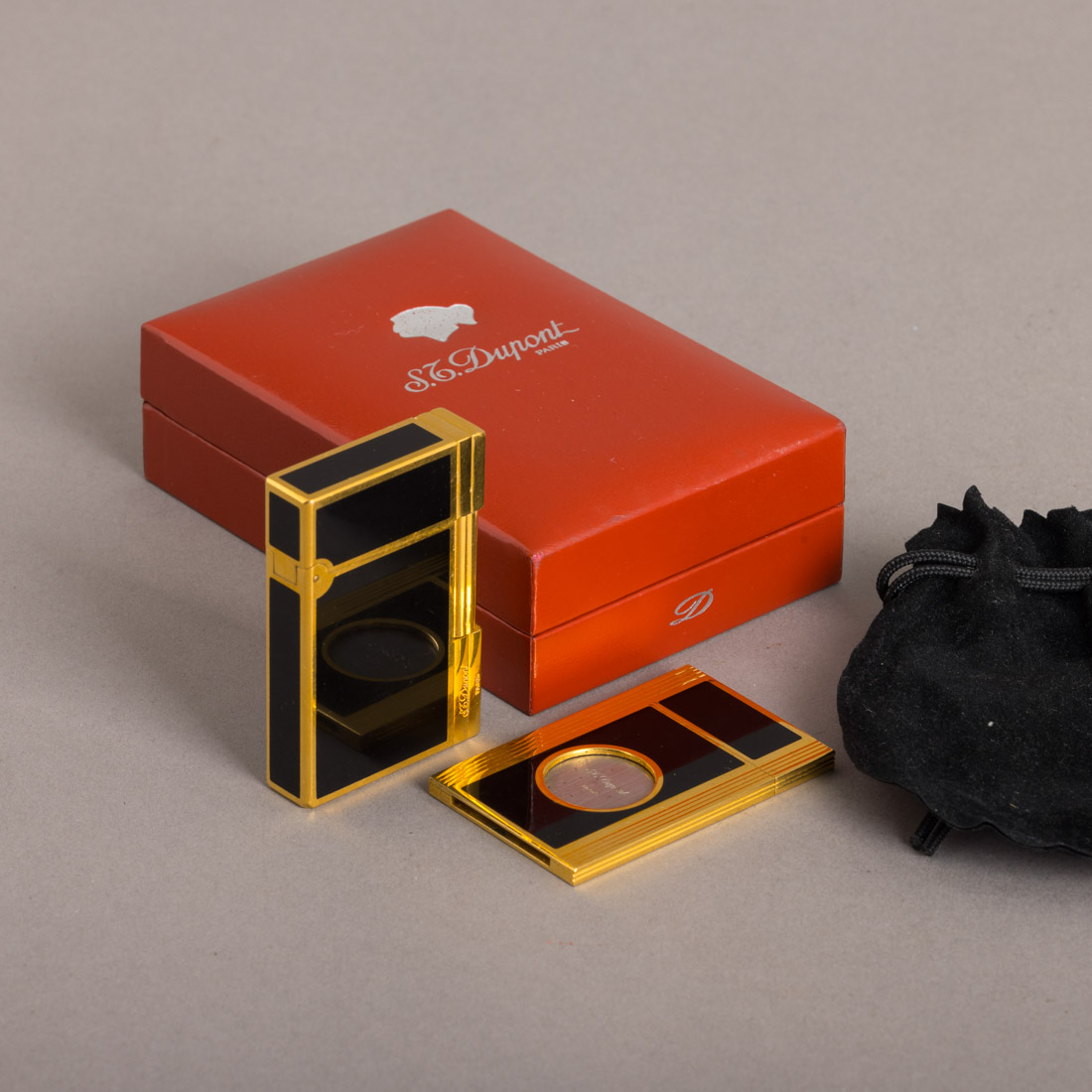 Em plaqué de ouro revestido parcialmente a laque de Chine preta. Marcado S.T.Dupont, numerado 10JRJ28. França. Sinais de uso e pequenos defeitos.