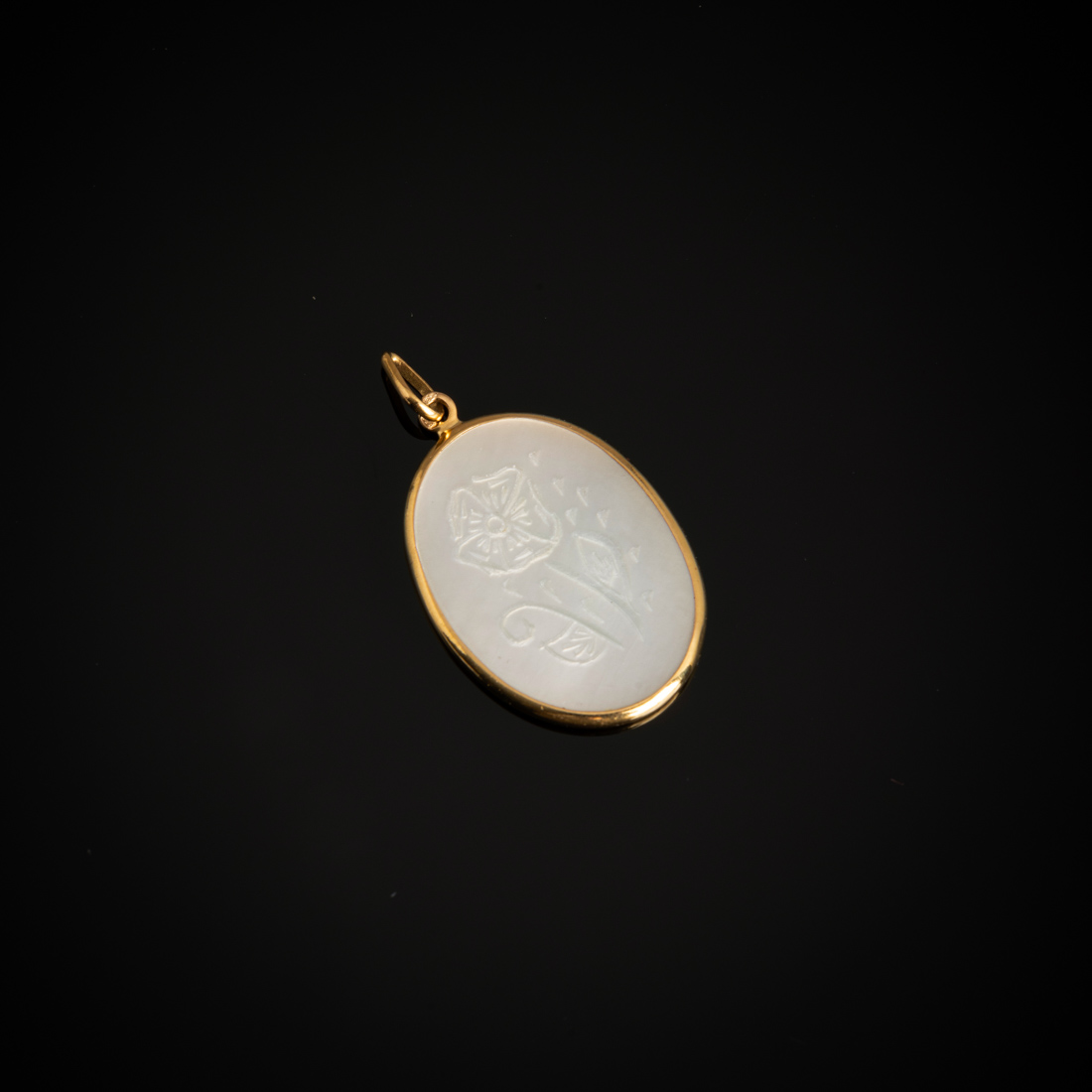 Aro em ouro português de 19,2Kt., com placa em madrepérola. Sinais de uso.