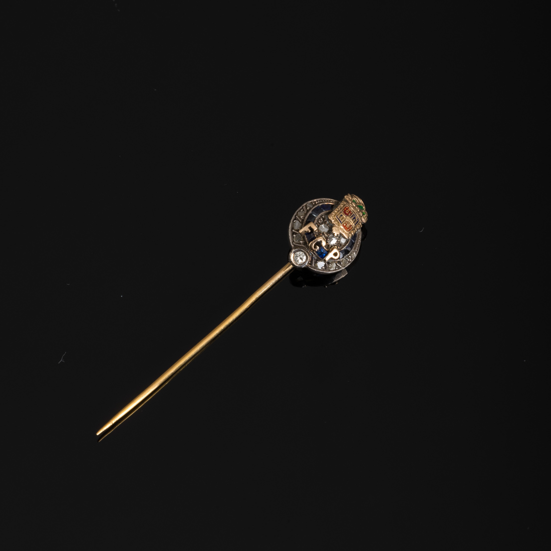Em ouro e prata, aplicações de esmaltes, cravejado com diamantes um em talhe de brilhante e rosa, safiras e esmeraldas. Sem marcas, ao abrigo do Decreto-Lei n.º 120/2017. Sinais de uso.