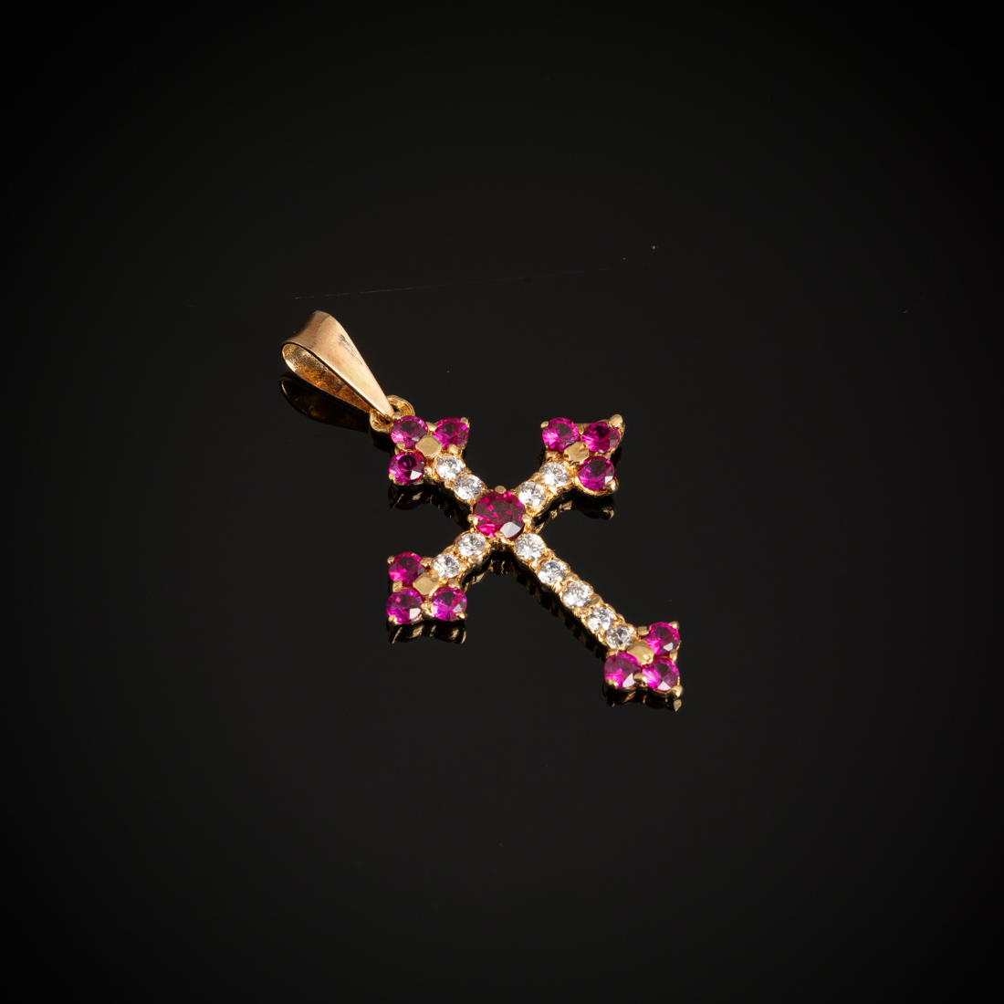 Em ouro português de 19,2Kt., contraste veado (pós 1985) cravejado com zircónias e rubis. Sinais de uso.