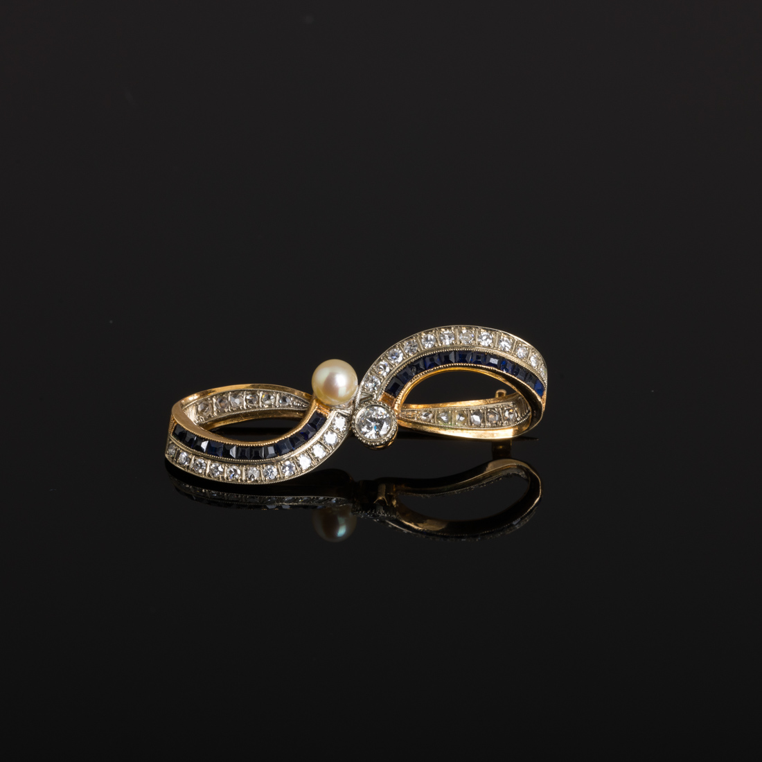 Em ouro bicolor cravejado com diamantes em talhe de brilhante, safiras e pérola de cultura (não testada). Sem marcas, ao abrigo do Decreto-Lei n.º 120/2017. Sinais de uso.