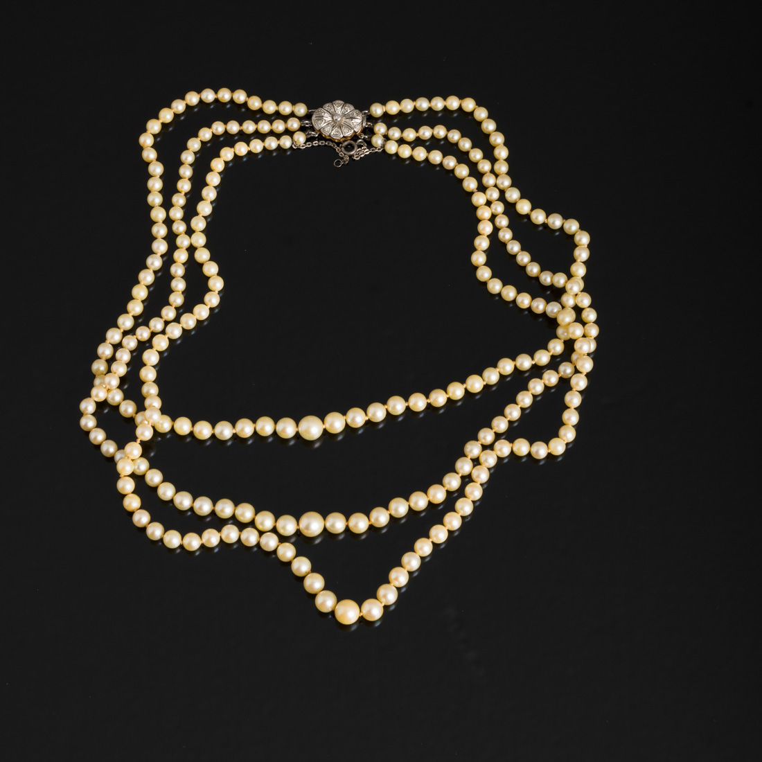 Com três fiadas de pérolas de cultura em degradé (não testadas), fecho em ouro bicolor cravejado com diamantes em talhe de brilhante. Sem marcas, ao abrigo do Decreto-Lei n.º 120/2017. Sinais de uso.