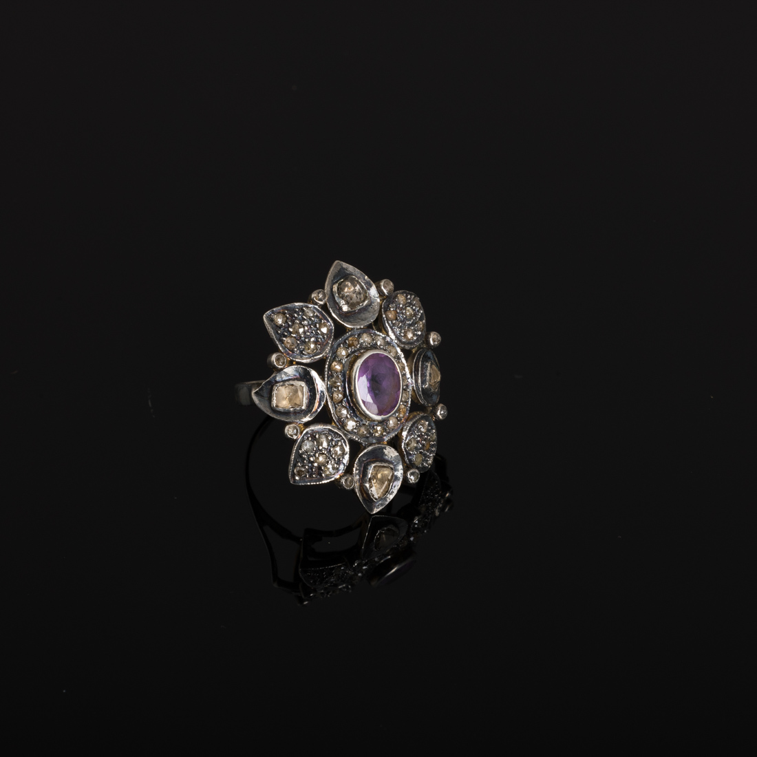 Em prata cravejada com ametista e diamantes em talhe rosa e rosa coroada. Sem marcas, ao abrigo do Decreto-Lei n.º 120/2017. Sinais de uso, defeitos.
