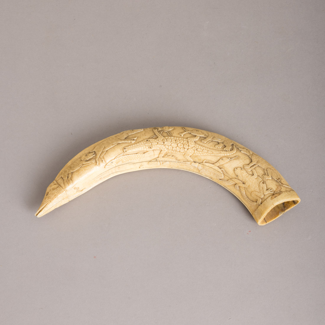 Esculpido com animais e figuras. Falha e pequenas fissuras.