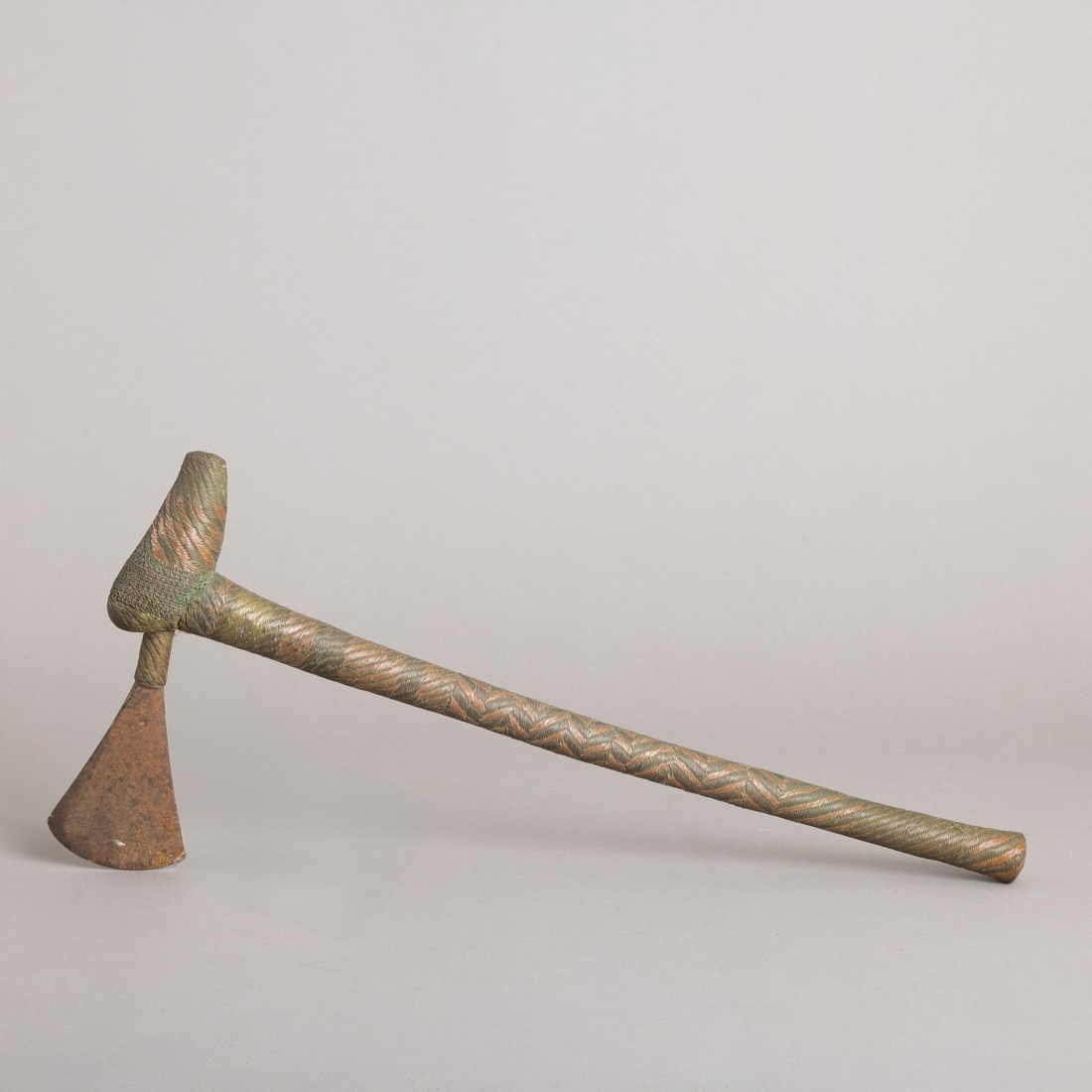 Cabo em madeira revestido a fio de cobre e de metal, lâmina em ferro. Africa. Moçambique. Sinais de uso.