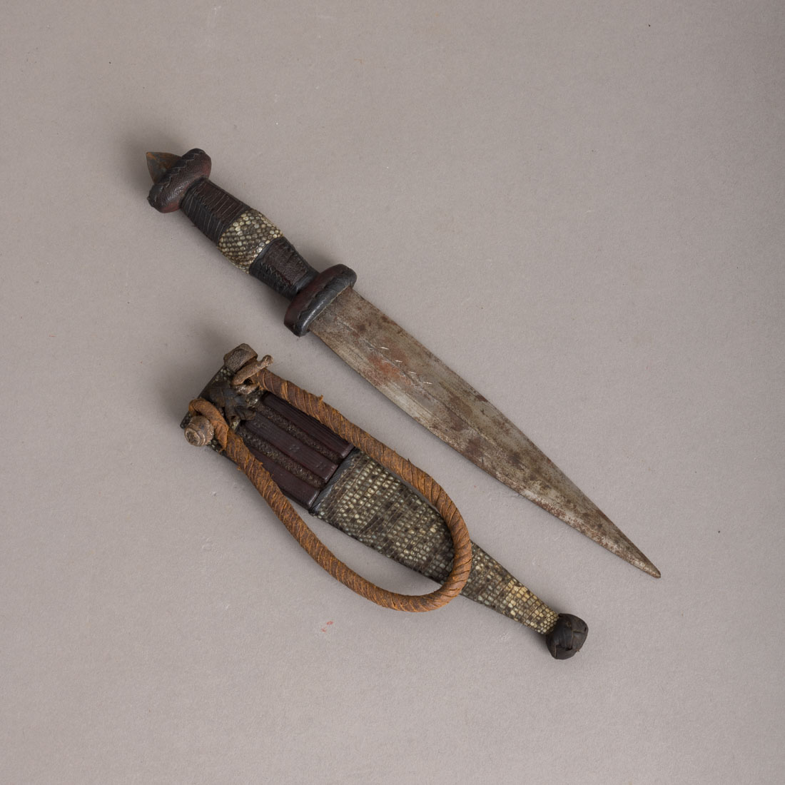 Bainha em couro com partes forradas a pele de cobra, possivelmente do golfo da Guiné. Punho pequeno cujo pomo é um quebra crânios. Lâmina rudimentar. Séc. XIX.