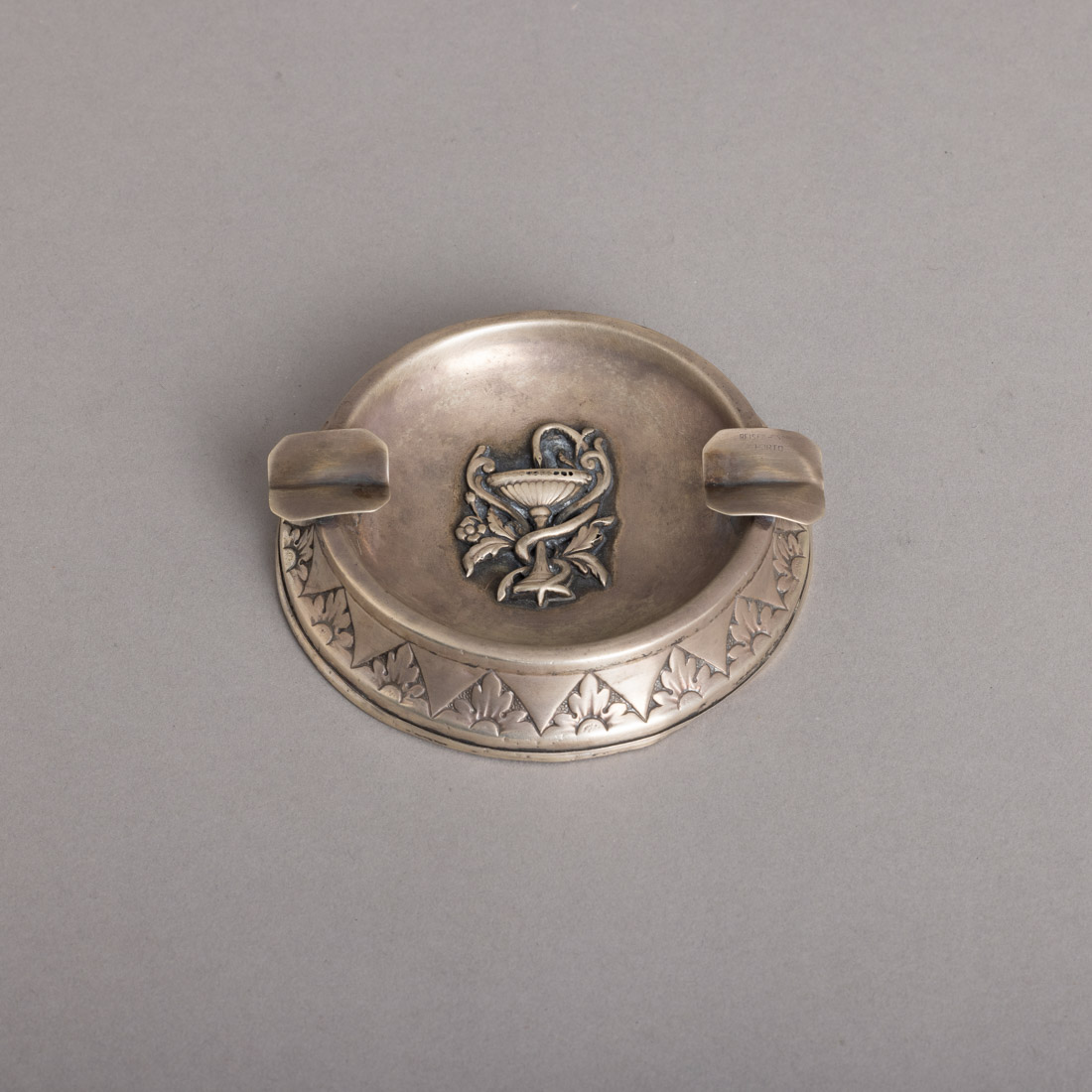 Em prata portuguesa contraste javali (1887-1937) de 833, decoração relevada "símbolo de farmácia". Fundo em madeira exótica. Amolgadelas e pequenos defeitos.