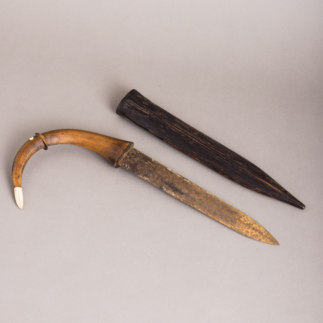 Do arquipélago da Malásia. Enorme punho em pescoço de ave aquática e bainha em madeira. Séc. XIX. Lâmina muito rudimentar, muito usada e oxidada.