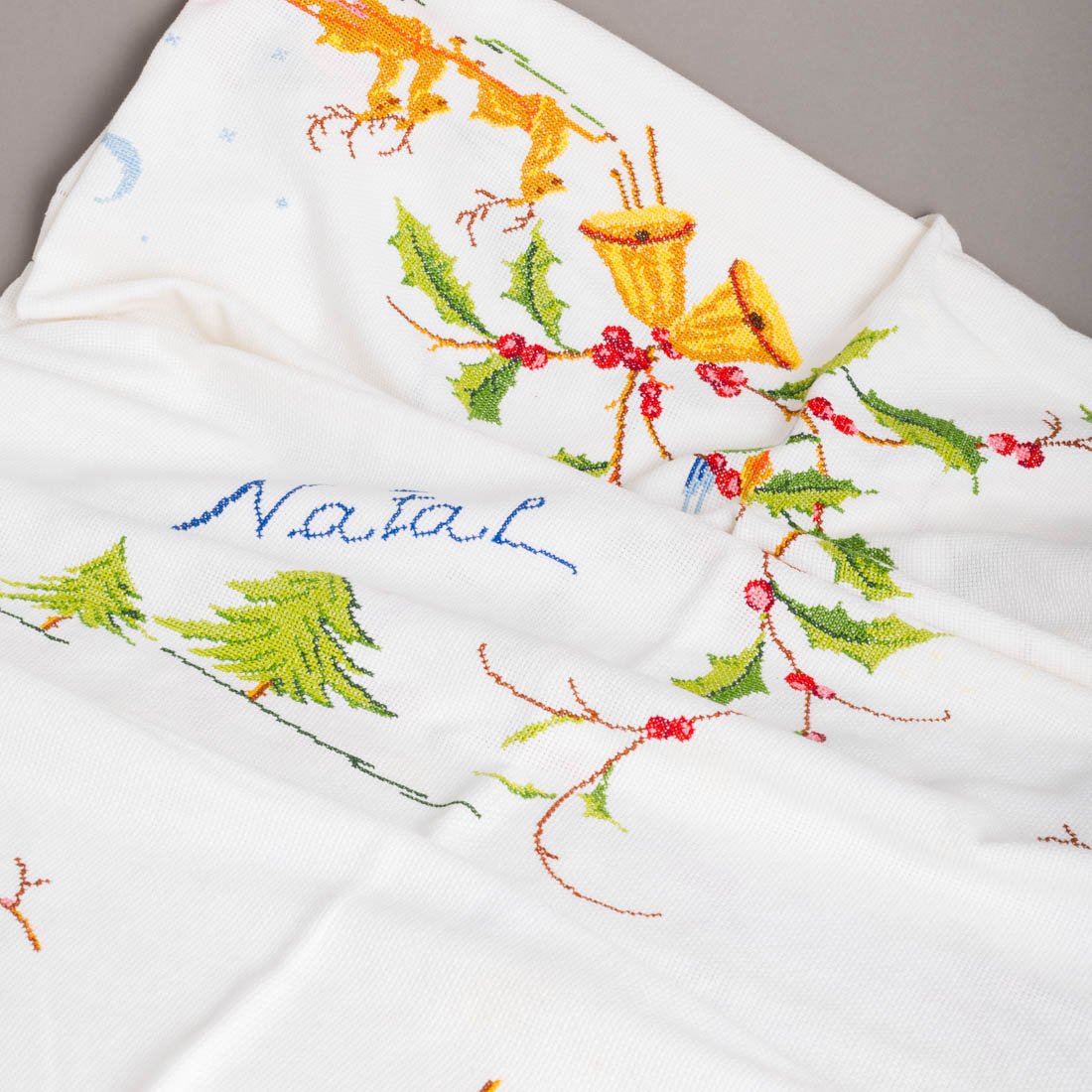 Bordada à mão a ponto de cruz com motivos de Natal. Sinais de uso e pequenas manchas.