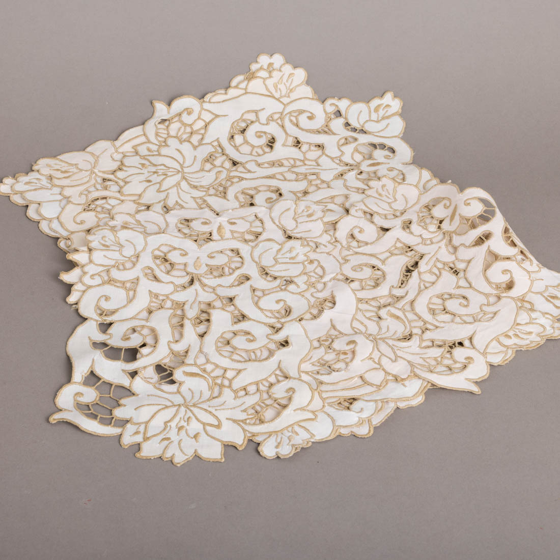 De dois tamanhos, em linho bordado à mão. Sinais de uso e pequenos defeitos.