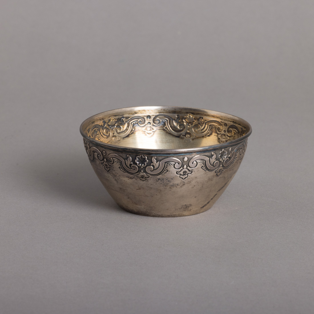 Em prata portuguesa contraste javali (1887-1937) de 833, marcada Reis Joalheiros, Porto, decoração relevada com enrolamentos e concheados. Sinais de uso.