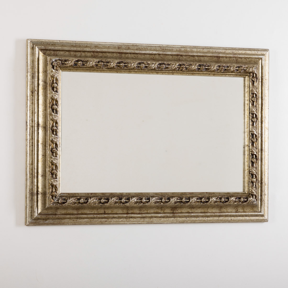Moldura em madeira e gesso entalhado e prateado. Sinais de uso.