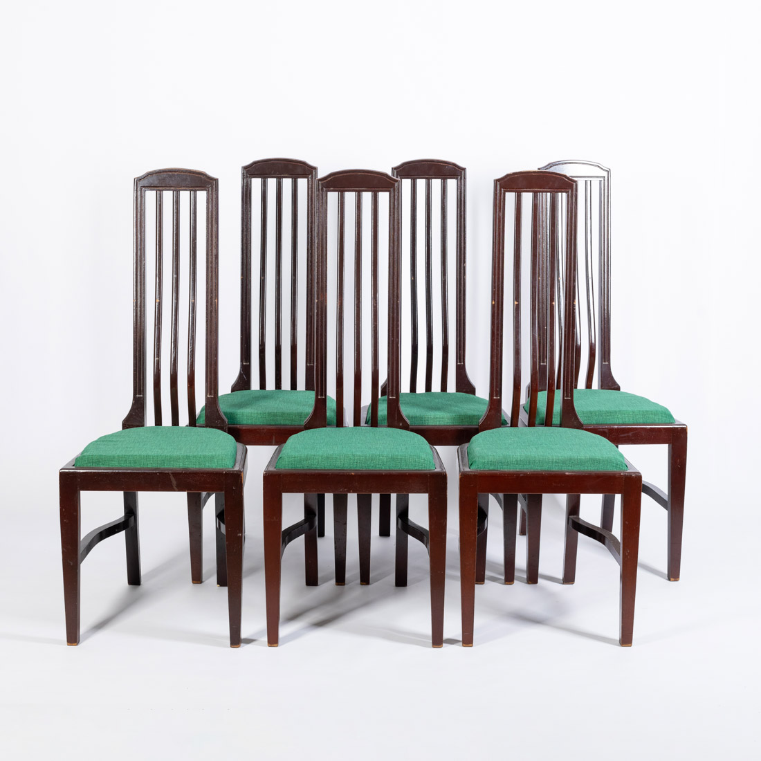 Em madeira pintada, espaldar alto com elementos ripados, assentos estofados a tecido verde. Sinais de uso, pequenos defeitos.