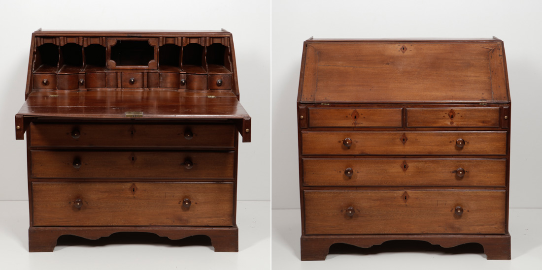 Em vinhático, de três gavetões e duas gavetas, puxadores torneados, no interior gavetas e escaninhos. Pequenas falhas e defeitos.