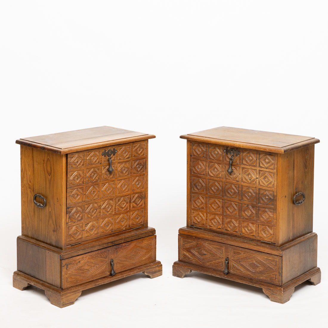 Em castanho com entalhamentos, com gaveta e porta de rebater "losangos", ferragens em ferro. Sinais de uso.