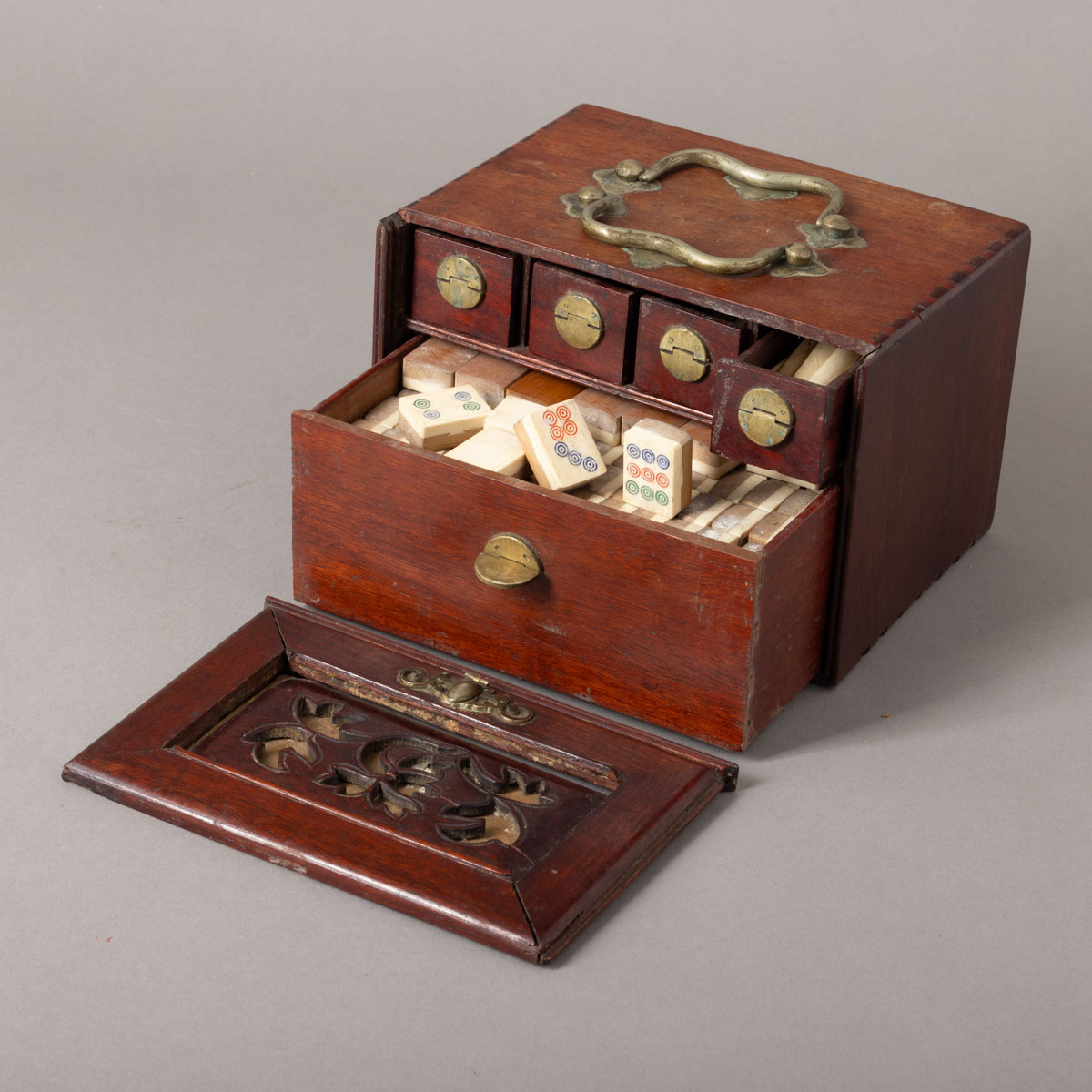 Com pedras em madeira e baquelite, caixa em tamarindo e metal. Pequenas falhas e pequenos defeitos.