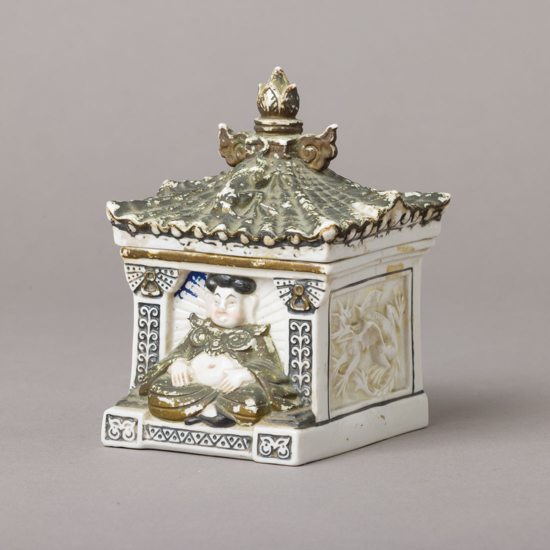 Em porcelana oriental, decoração relevada e policromada "Divindade e dragões". Desgaste na pintura e cabelo.