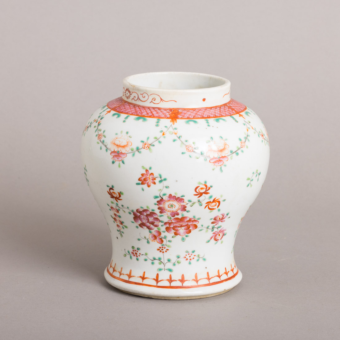Em porcelana da China, Companhia das Índias, Séc. XVIII, decoração policromada com esmaltes da família rosa "flores e grinaldas". Restauros e pequena esbeiçadela.