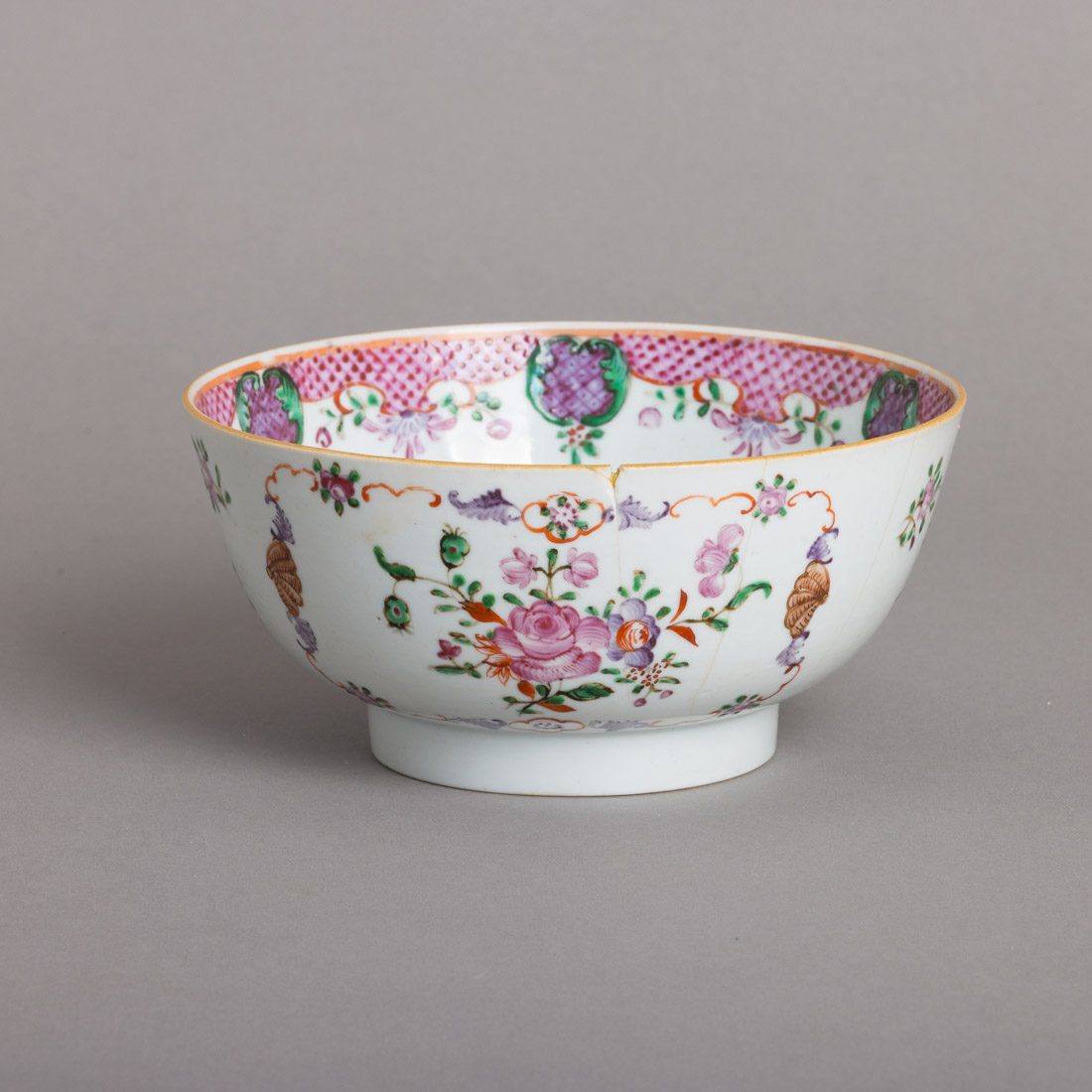 Em porcelana da China, Companhia das Índias, Séc. XVIII, decoração policromada e dourada com esmaltes da família rosa "flores". Esbeiçadela e cabelos.