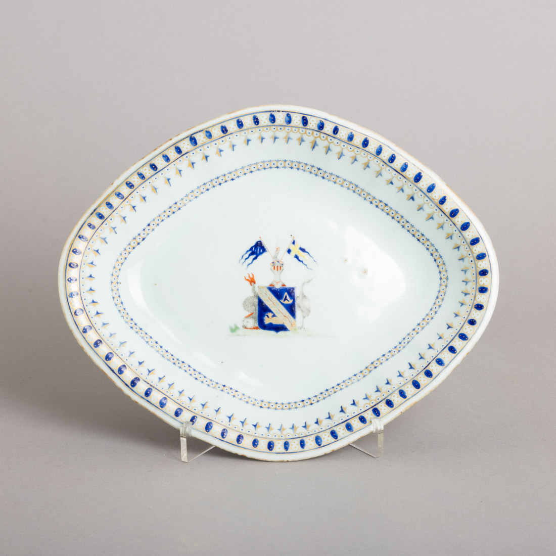 Em porcelana da China, Companhia das Índias, Séc. XIX decoração policromada e dourada com armas de família europeia. Sinais de uso.
