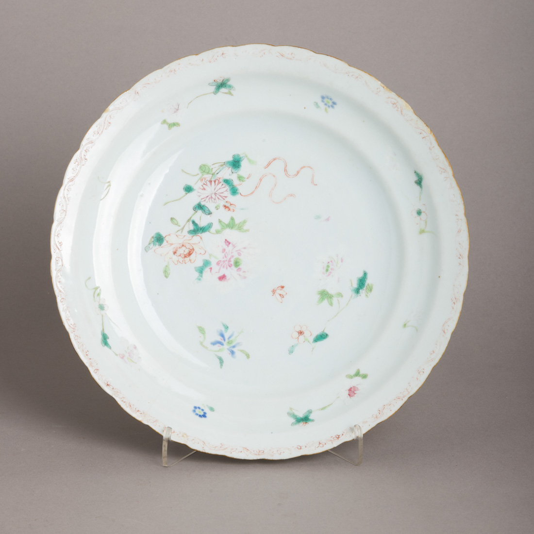 Em porcelana da China, Companhia das Índias, Séc. XIX, decoração policromada com esmaltes da família rosa "flores". Desgaste, esbeiçadelas e cabelo.