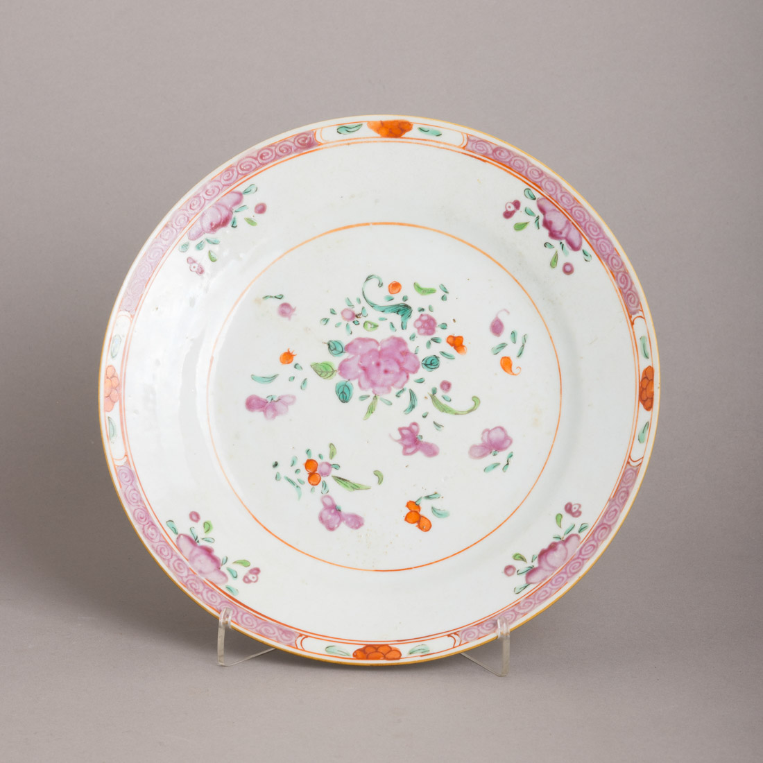 Em porcelana da China, Companhia das Índias, Séc. XVIII, decoração policromada com esmaltes da família rosa "flores". Desgaste.