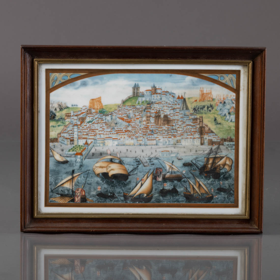 Em porcelana moldada (1980-1992), decoração policromada com "A mais antiga vista panorâmica de Lisboa" conforme exemplar existente no Museu Castro Guimarães de Cascais. Série limitada a 2500 exemplares. Emoldurada. Sinais de uso.
