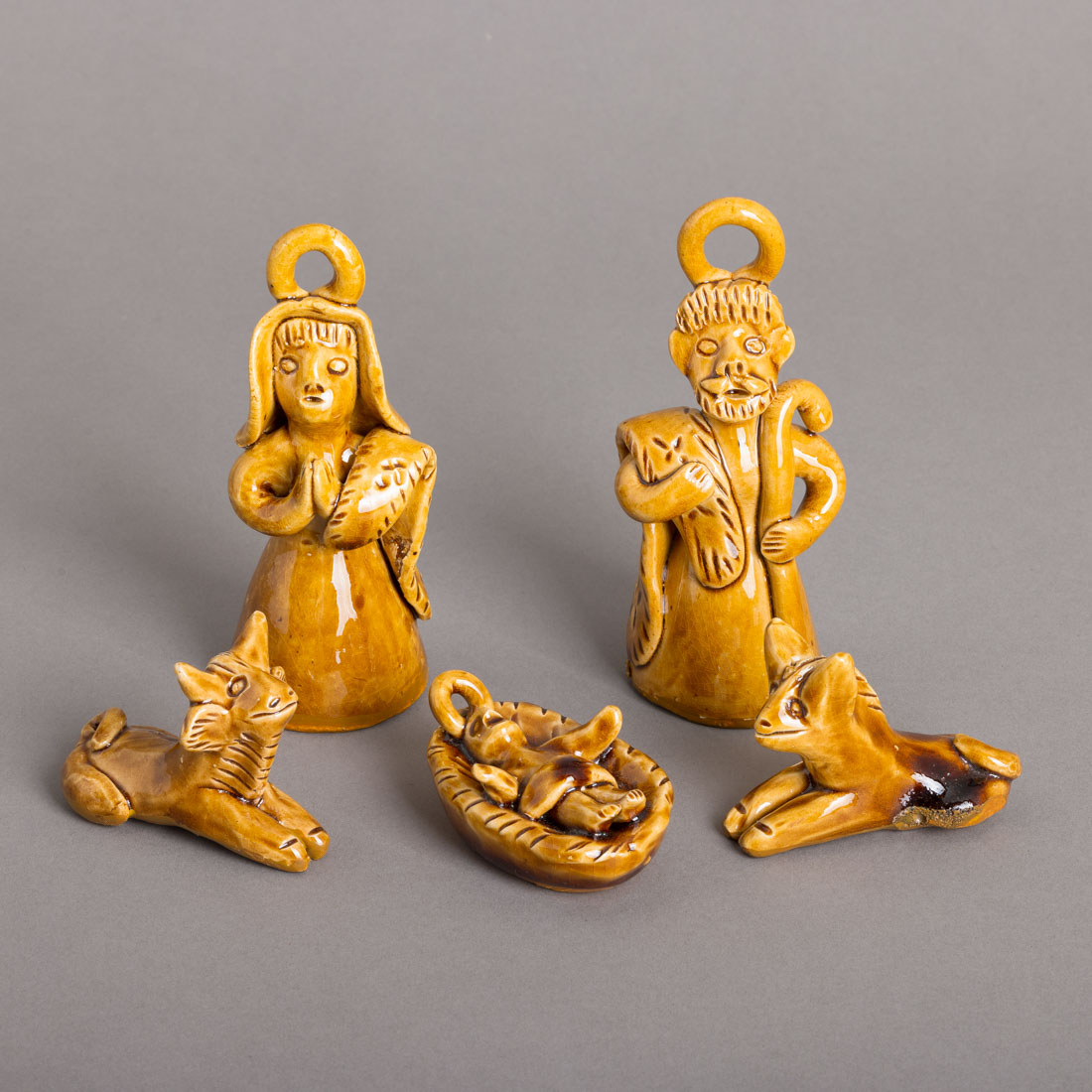 Com cinco esculturas em cerâmica vidrada, decoração monocroma, assinadas. Sinais de uso.