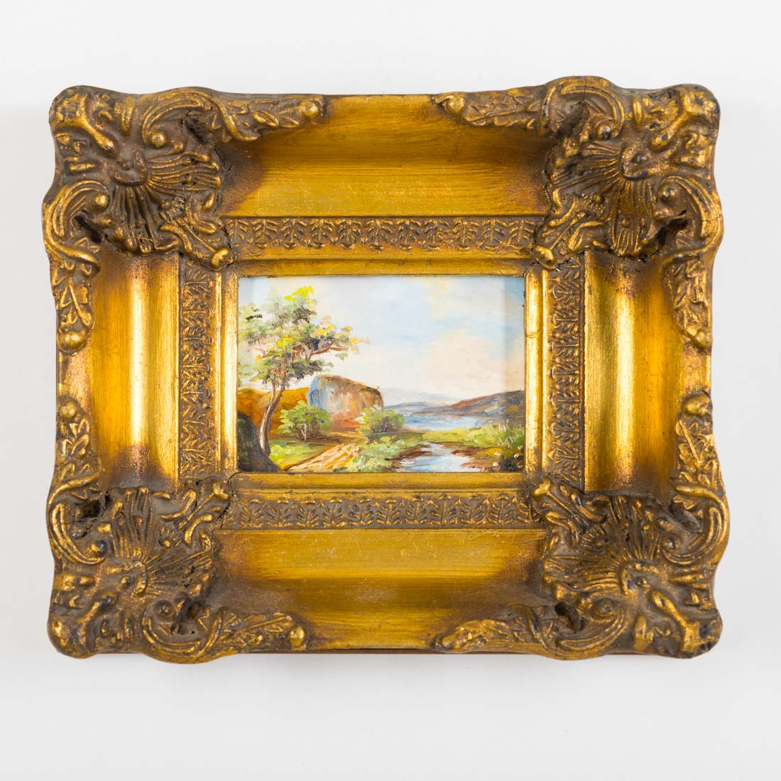 Duas miniaturas a óleo sobre madeira, molduras douradas.