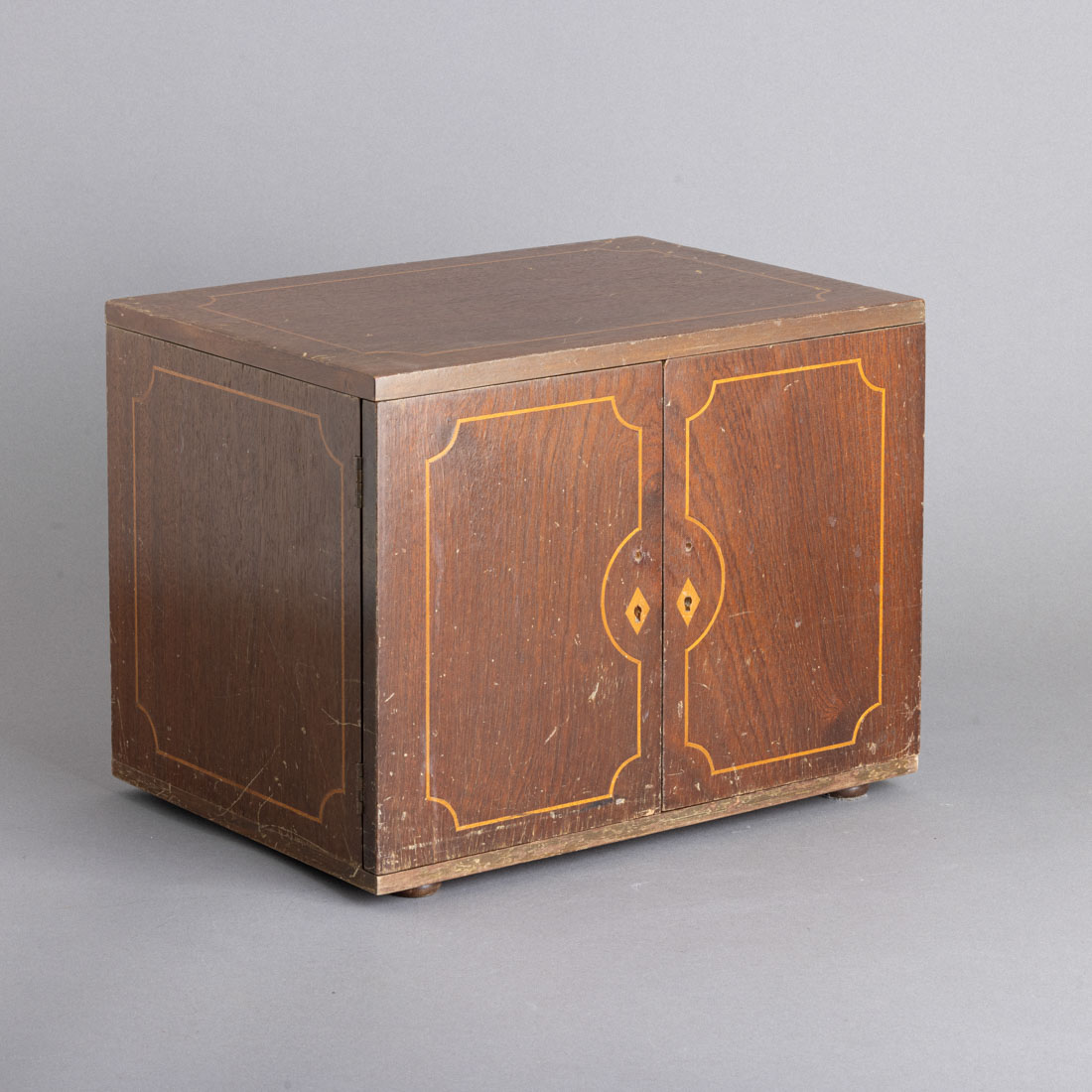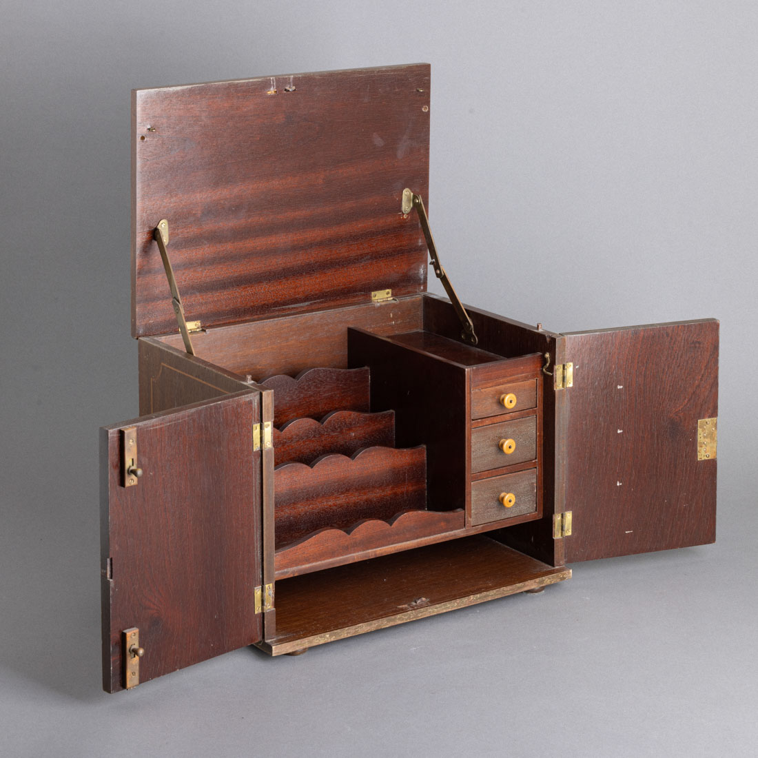 Em mogno e folheada a mogno com filetes embutido, de duas portas, no interior gavetas e escaninhos. Sinais de uso, pequenas falhas e defeitos.
