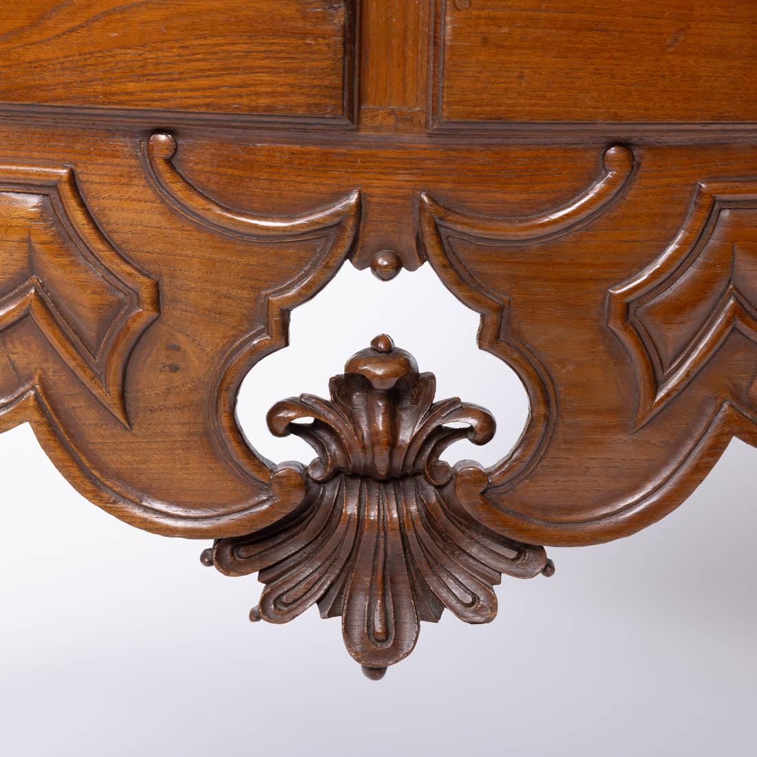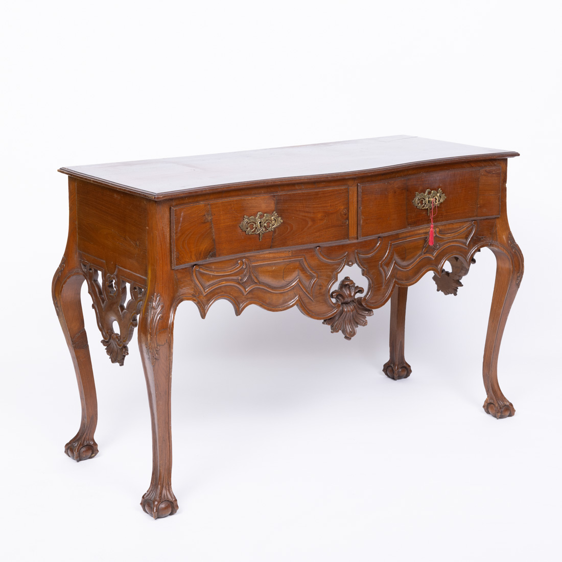 Estilo D. João V/D. José, em diferentes madeiras com entalhamentos, saiais recortados e vazados, de duas gavetas. Séc. XIX. Sinais de uso, pequenos defeitos e restauros.