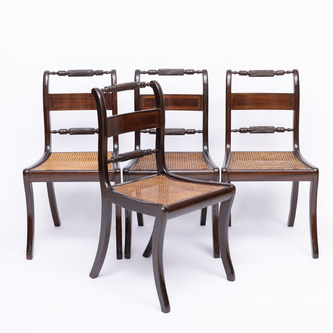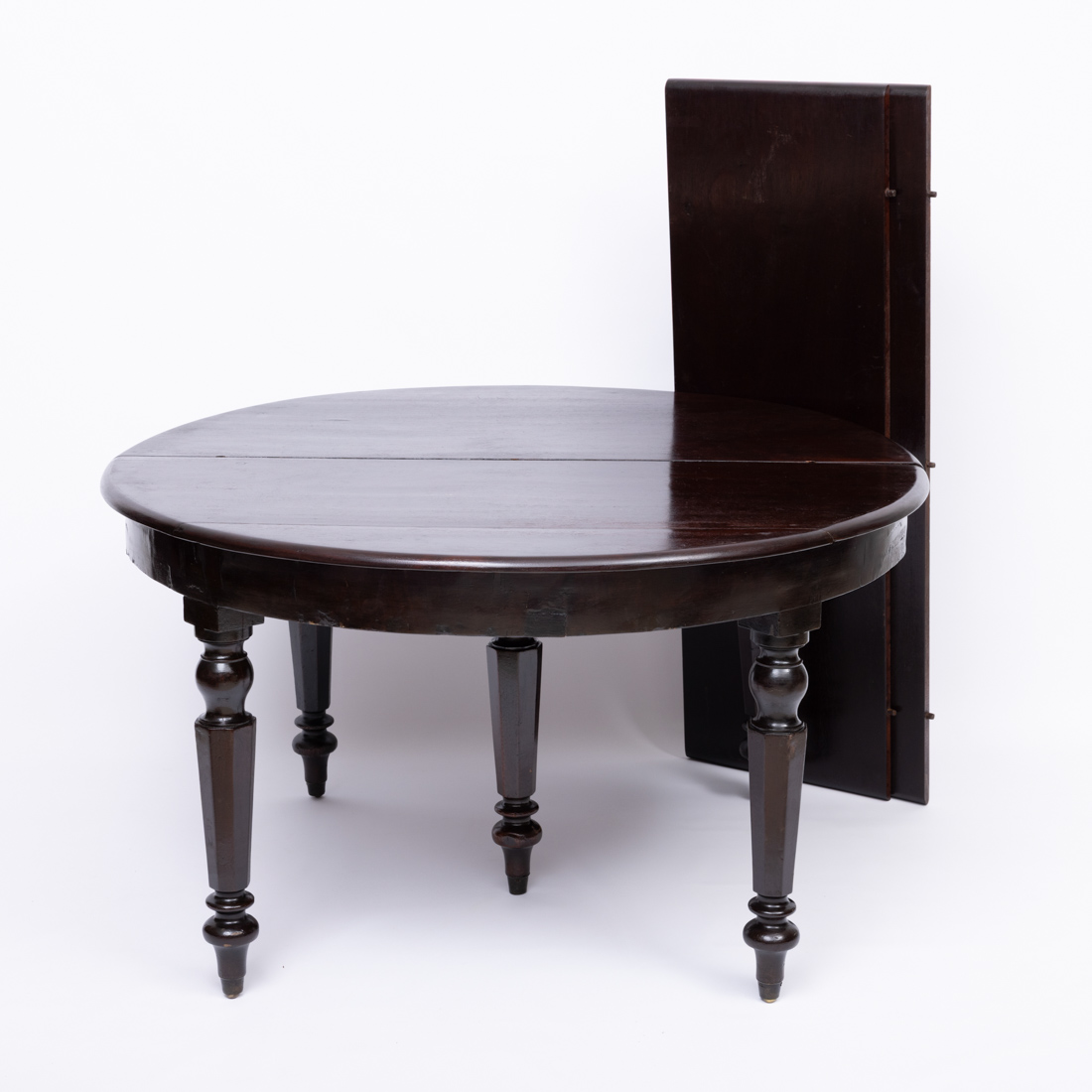 Em madeira escurecida com duas tábuas extensão, pernas facetadas e torneadas, cadeiras de rolinho com fundos em palhinha. Sinais de uso, pequenas falhas e defeitos.