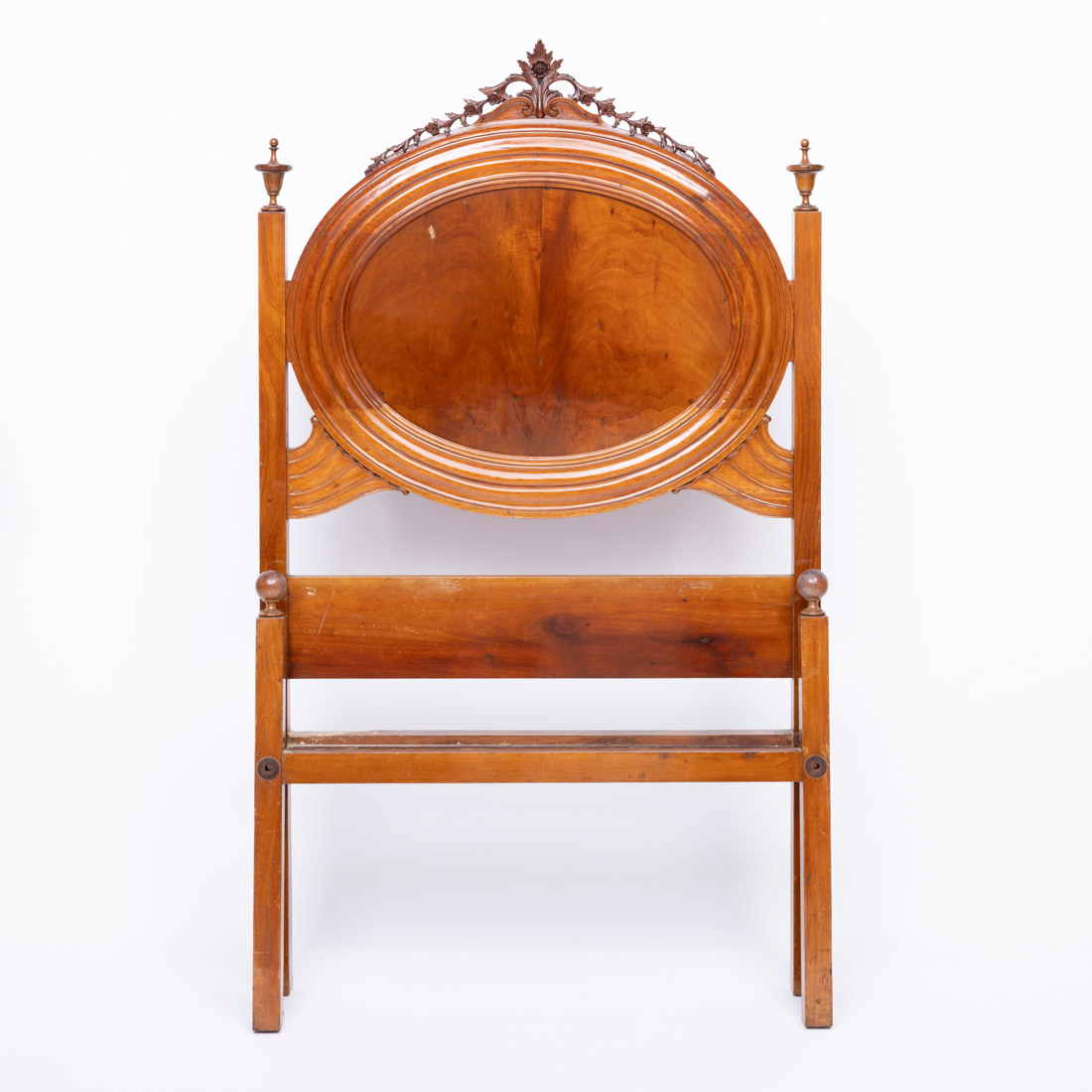 Estilo D. Maria, em diferentes madeiras com entalhamentos, cabeceira com medalhão elíptico. Sinais de uso, pequenas falhas e pequenos defeitos.
