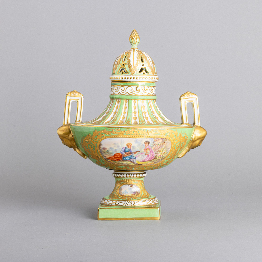 Em porcelana moldada e relevada, decoração policromada e dourada sobre fundo verde, reservas "cena galante" e Paisagens". Europa. Marcada. Sinais de uso, leve desgaste e pomo da tampa colado.