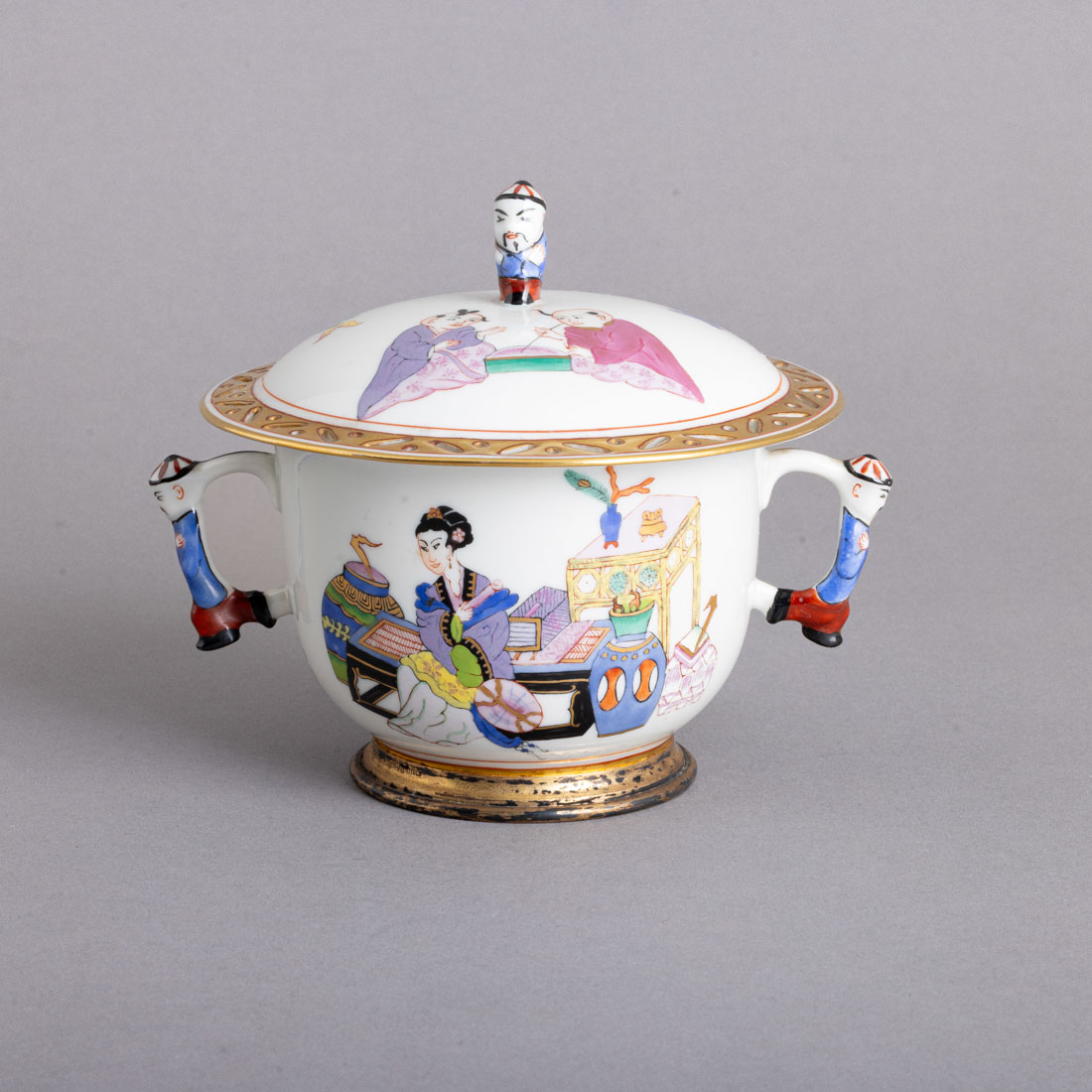 Em porcelana de Herend, decoração policromada e dourada "figuras", pegas relevada. Húngara, marcada, base em prata portuguesa dourada contraste águia (1938-1984) de 916 - Leitão e Irmão. Sinais de uso.