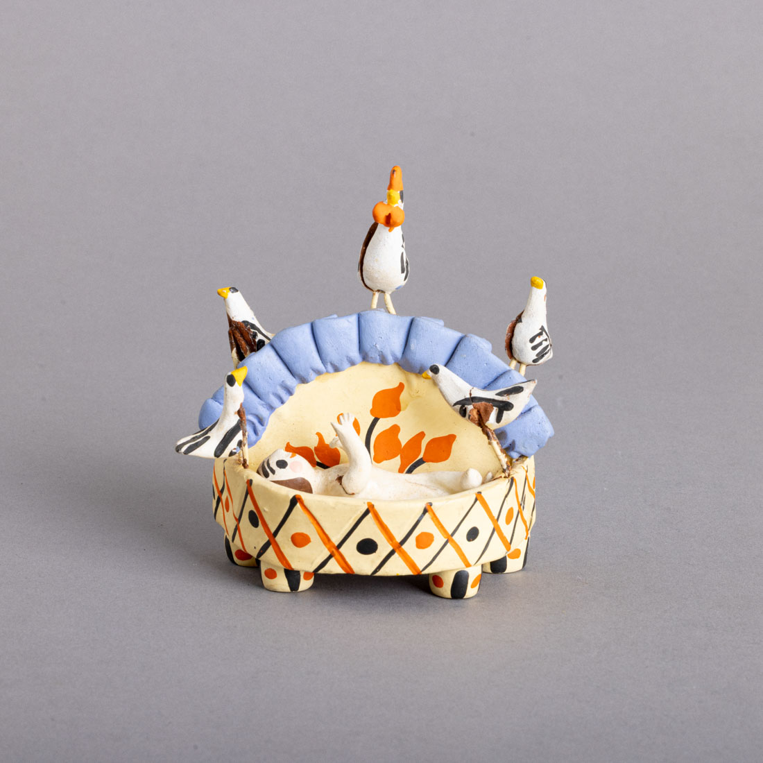 Escultura em barro de Estremoz, decoração policromada. Marcada. Falhas, defeitos e colagens.