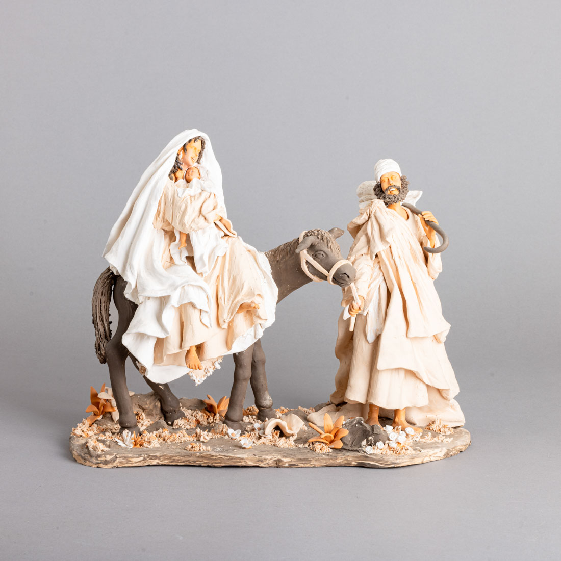 Grupo escultórico em barro, decoração policromada, assinado e datado Olga Marques 1997. Pequenas falhas e algumas partes soltas.