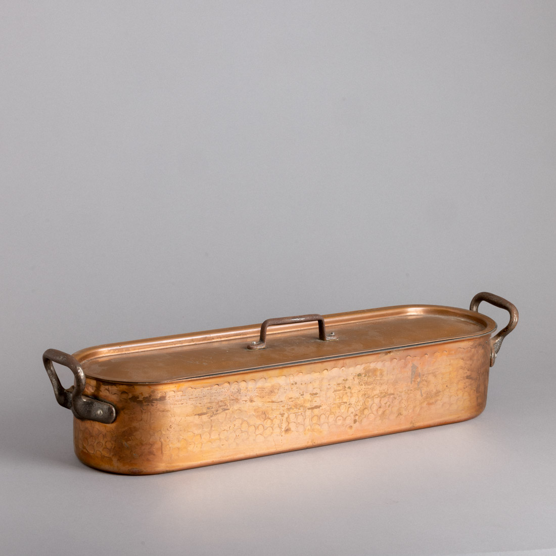 De grandes dimensões, em cobre, pega da tampa e asas em ferro. Com a grade interior. Sinais de uso e pontos de oxidação.