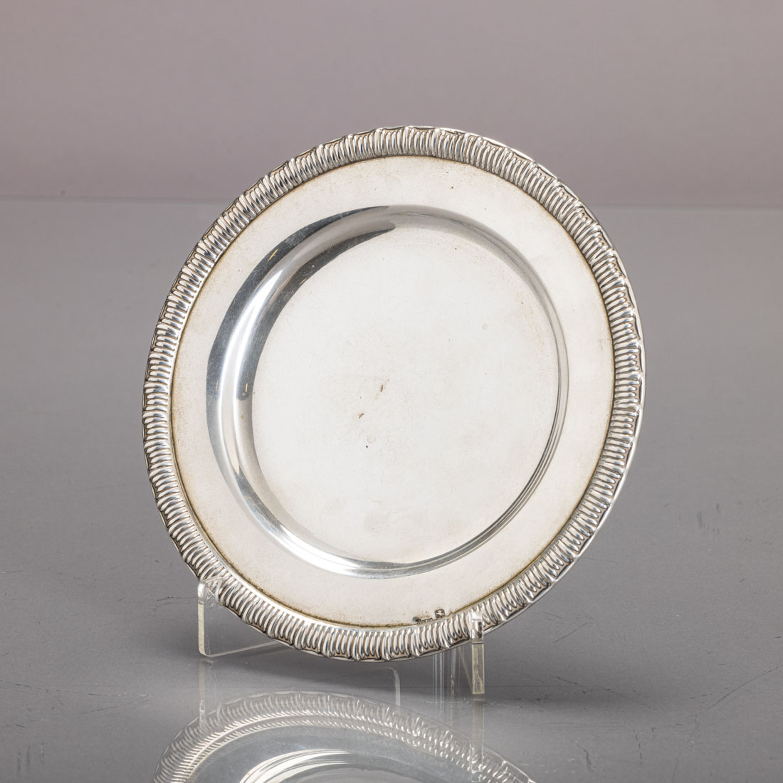 Em prata portuguesa contraste águia (1938-1984) de 833, marcada Topázio, decoração lisa, bordo relevado. Sinais de uso.