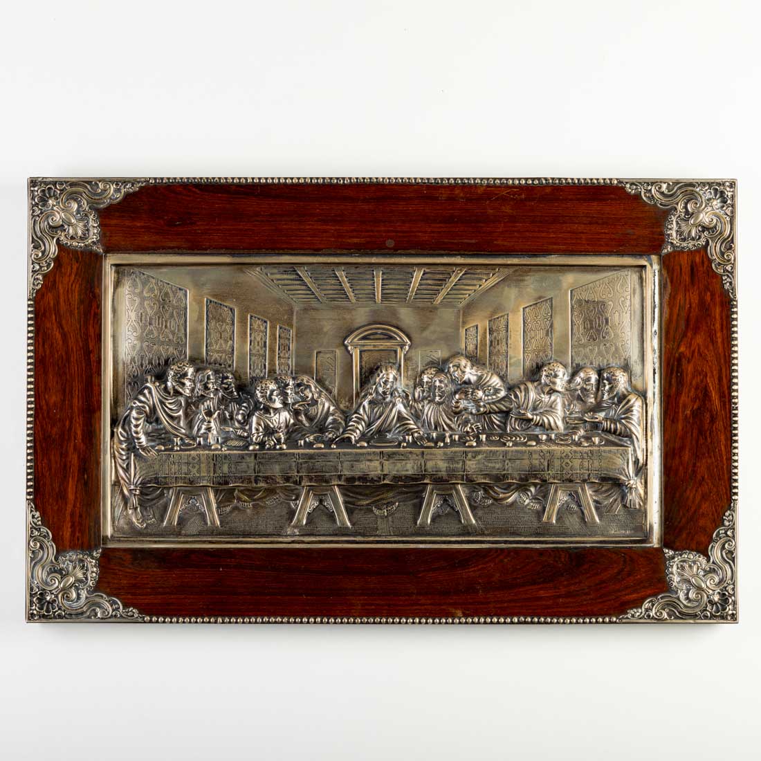 Moldura em pau santo, aplicações e placa em prata portuguesa contraste águia (1938-1984) de 833, marcada Topázio, decoração relevada. Sinais de uso.