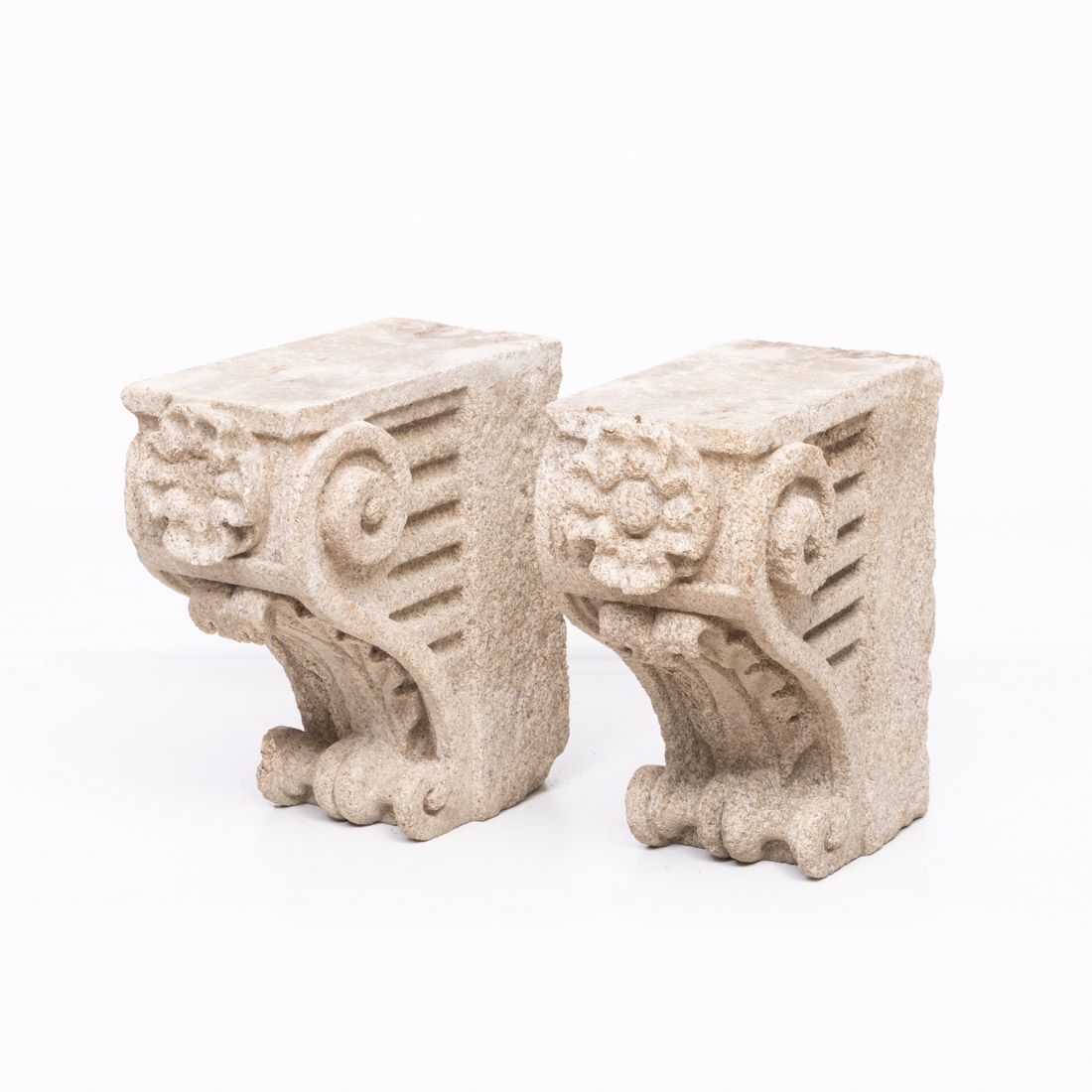 Esculpidas em granito com volutas e rosaceas. Pequenas falhas.
