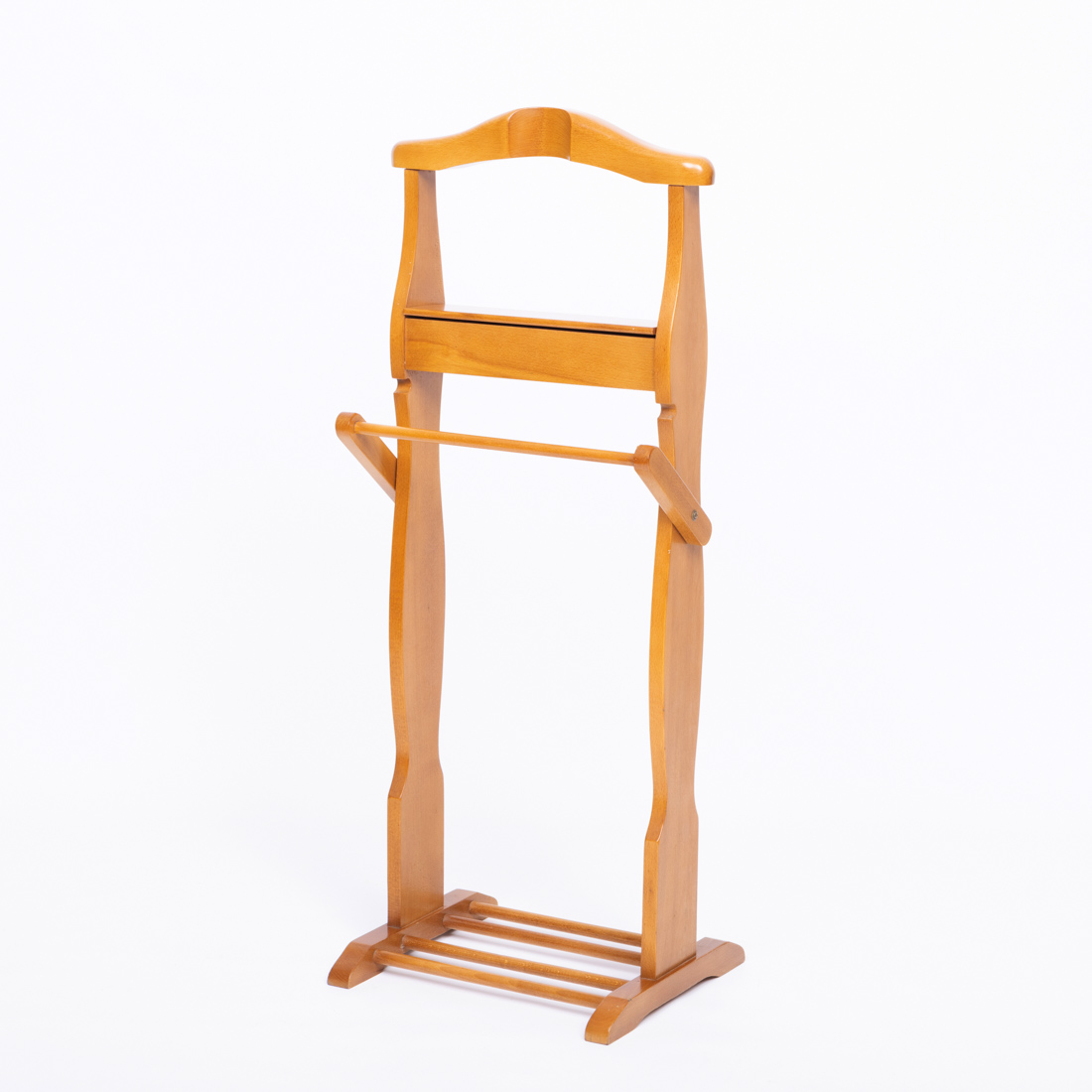 Em faia, com cabide, bandeja e suporte para calças. Sinais de uso.