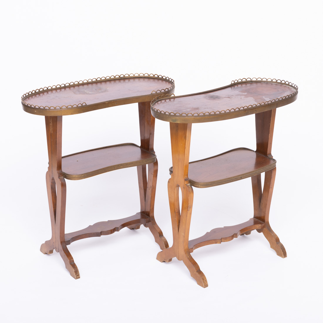 Em diferentes madeiras, tampos em forma de rim moldurados por gradinha em metal amarelo. Defeitos e pequenas falhas.