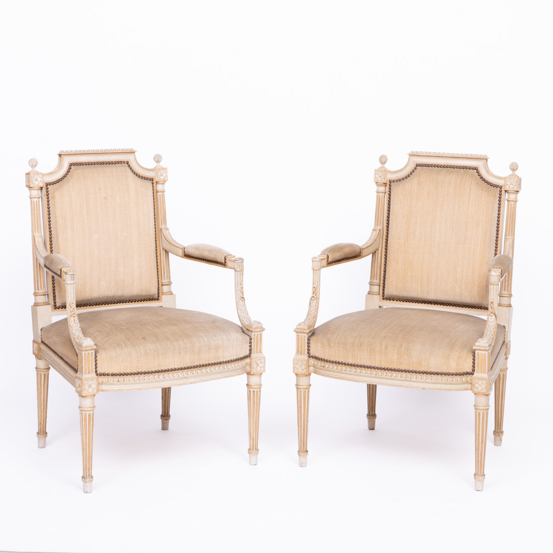 Estilo Luis XVI, em madeira entalhada e pintada, costas e assentos estofados a tecido com pregaria. Pequenos defeitos.