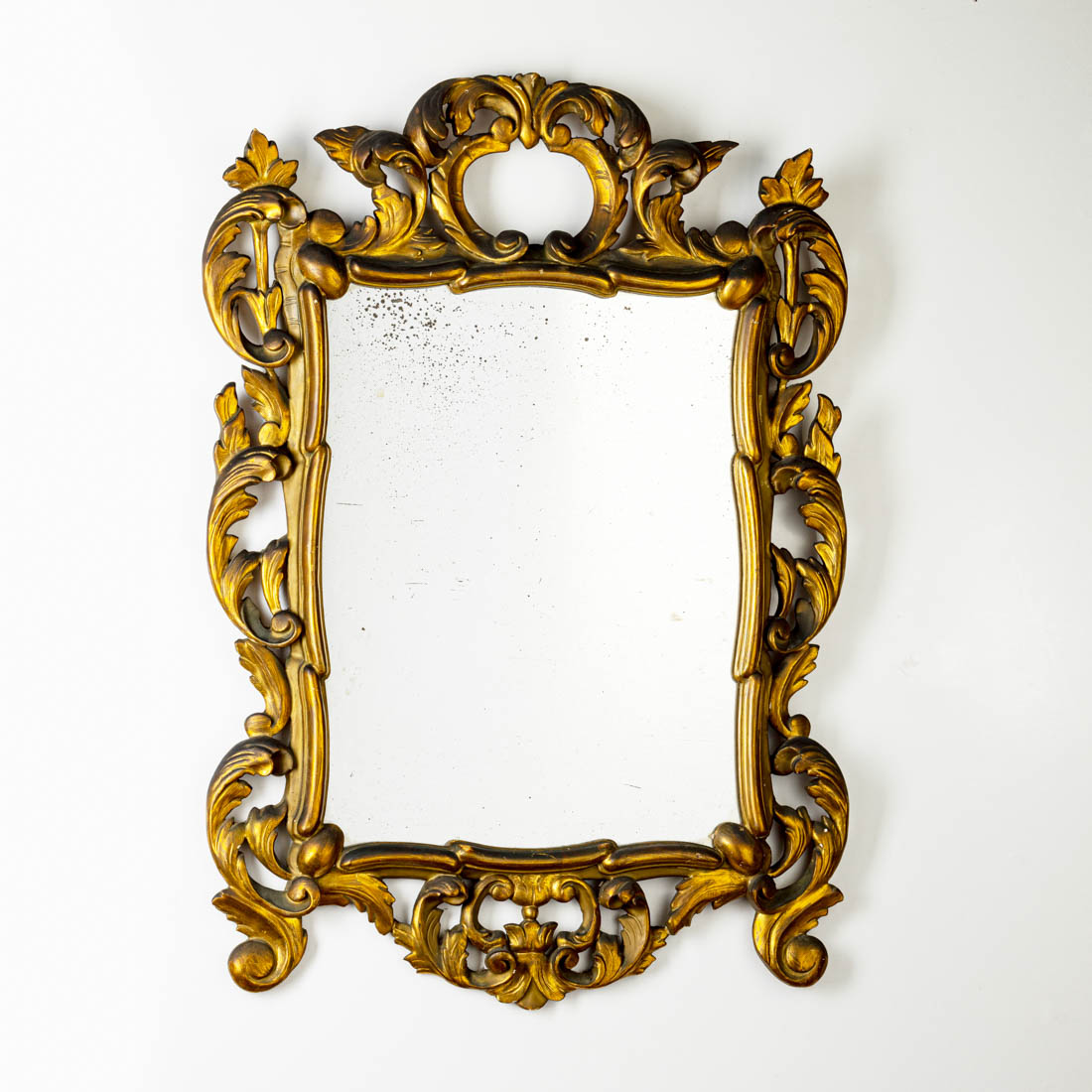 Moldura em madeira entalhada e dourada com elementos vegetalistas, Sinais de uso e pequenas falhas.
