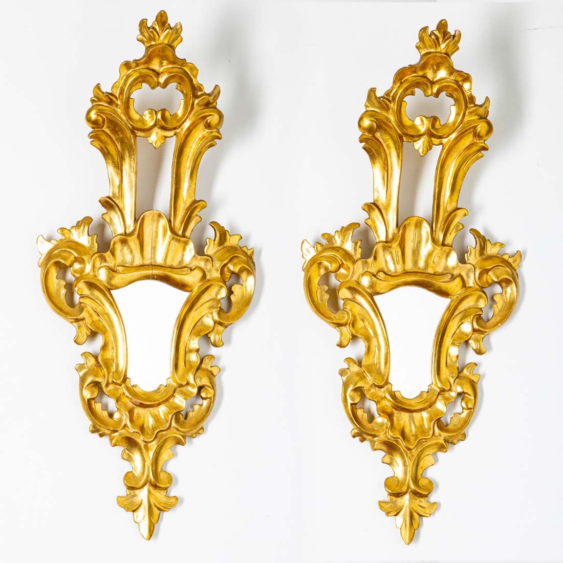 Em madeira entalhada e dourada, decoração com enrolamentos e elementos vegetalista. Sinais de uso, desgastes no dourado e pequenas falhas num deles.